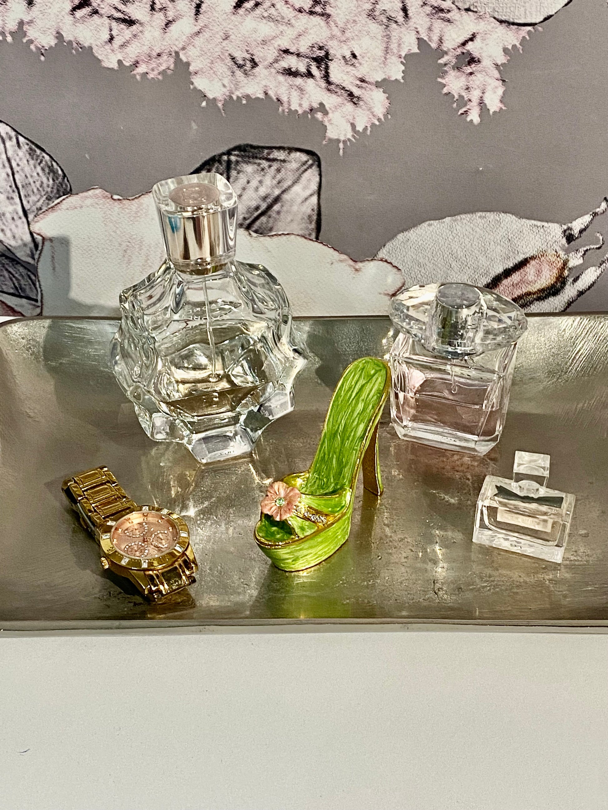 This trinket box features a green high heel shoe with a pink flower and is embedded with gems. Keep a ring or small jewelry in this box, gift to a friend or keep as décor!