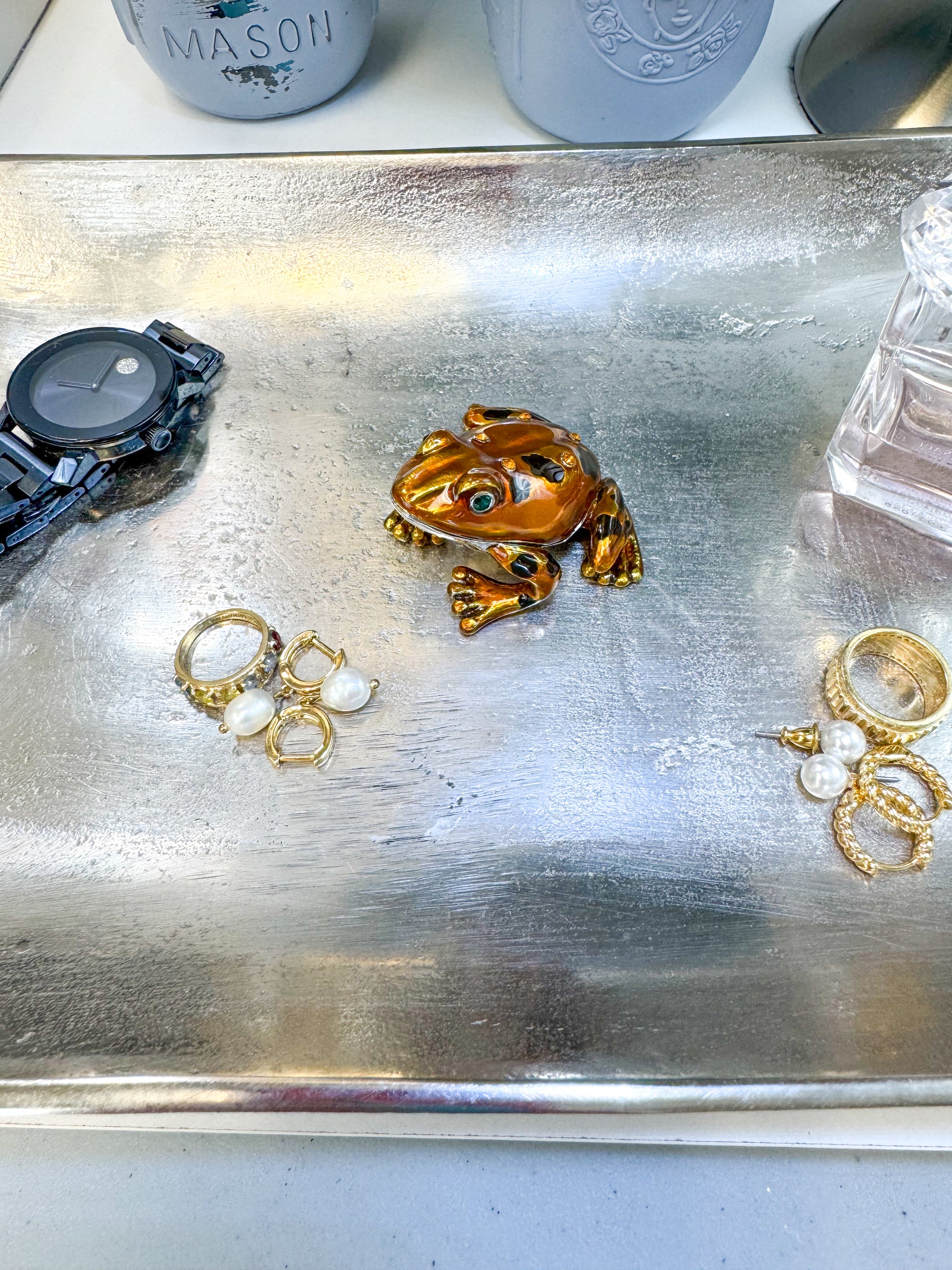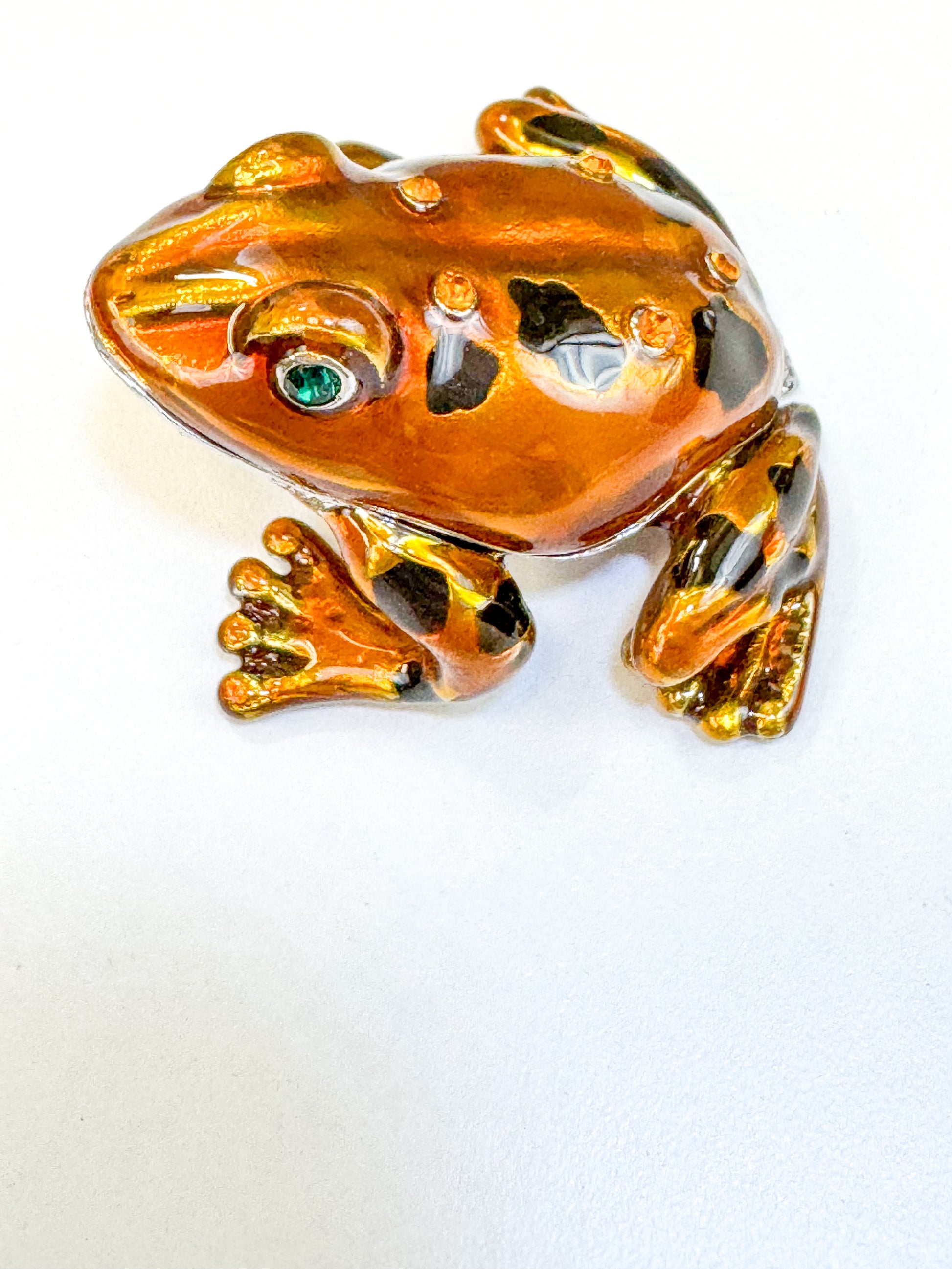 This frog shaped trinket box is orange with black leopard spots, emerald eyes and amethyst gems. Keep this box as home décor, store small jewelry or gift to a friend or girlfriend.