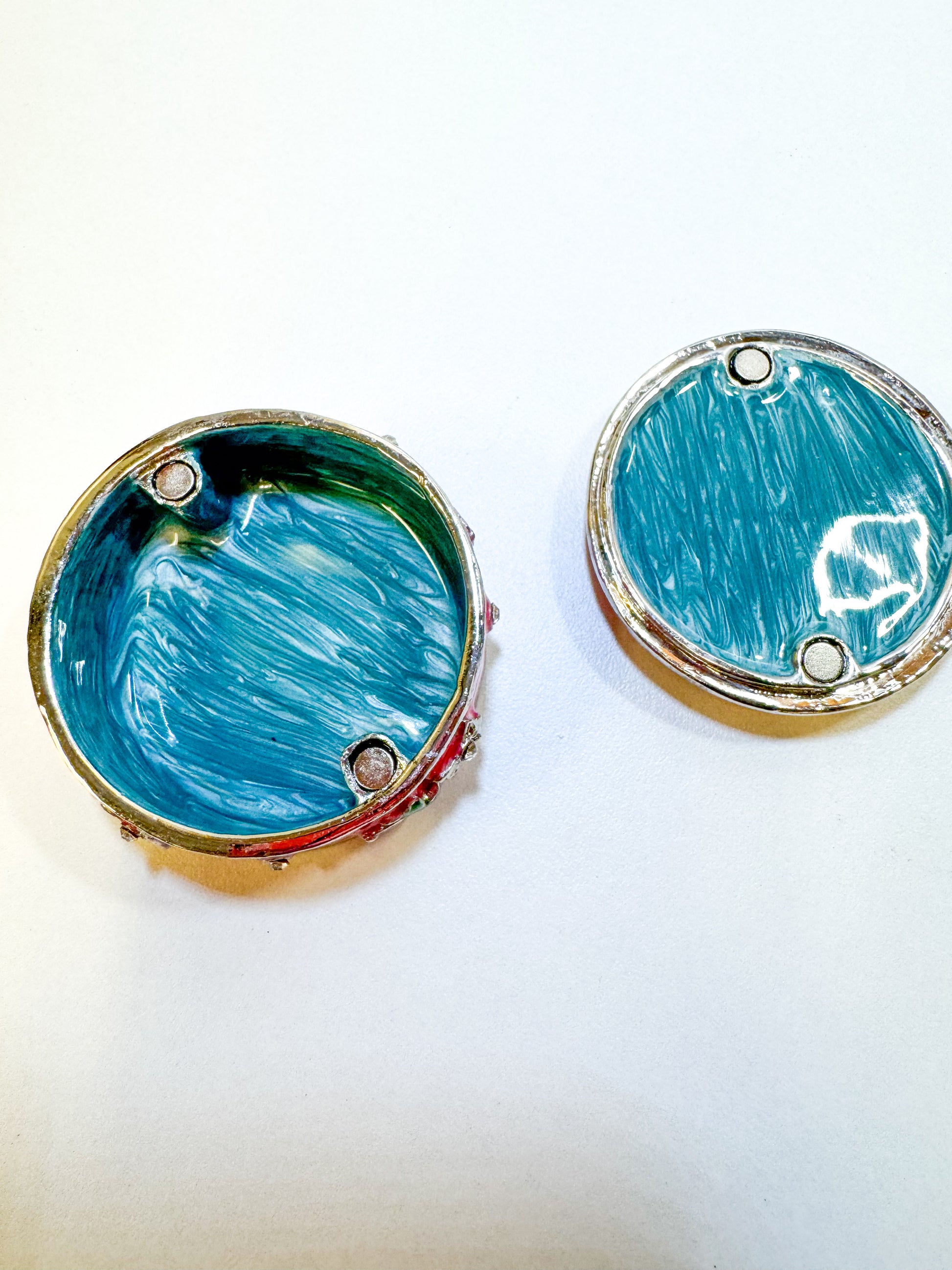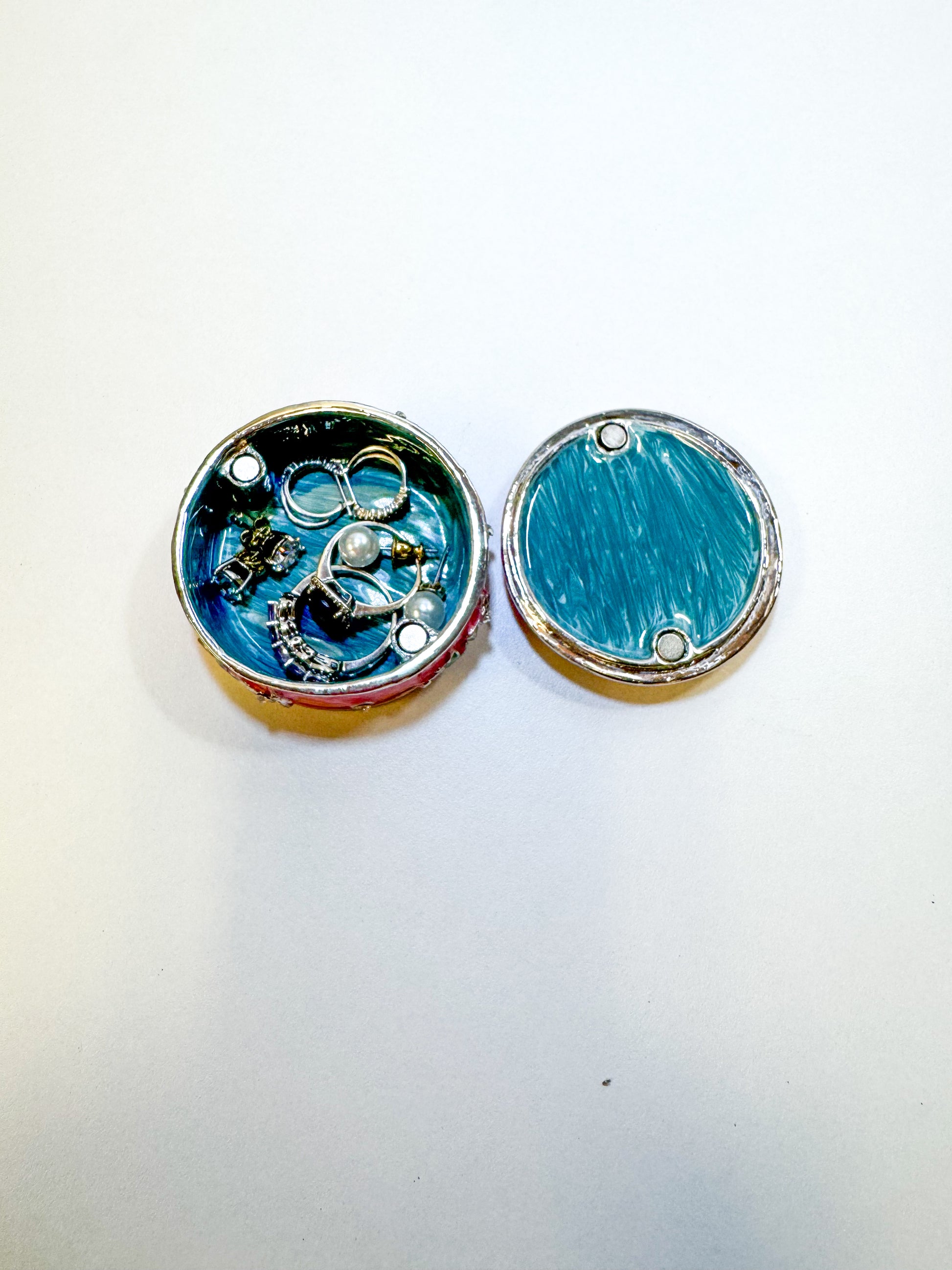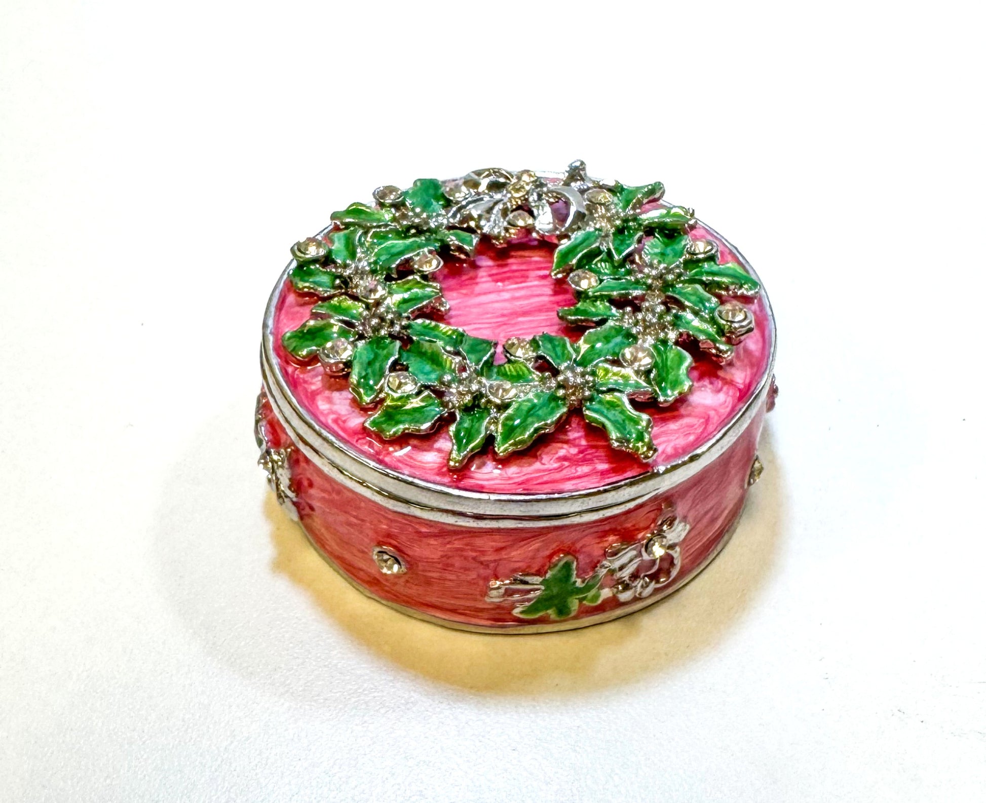 This round pink trinket box has a green wreath wrapped around it with silver and crystals. Keep a ring or small jewelry in this box, gift to a friend! This would make a great Christmas gift or fun décor for the holidays.