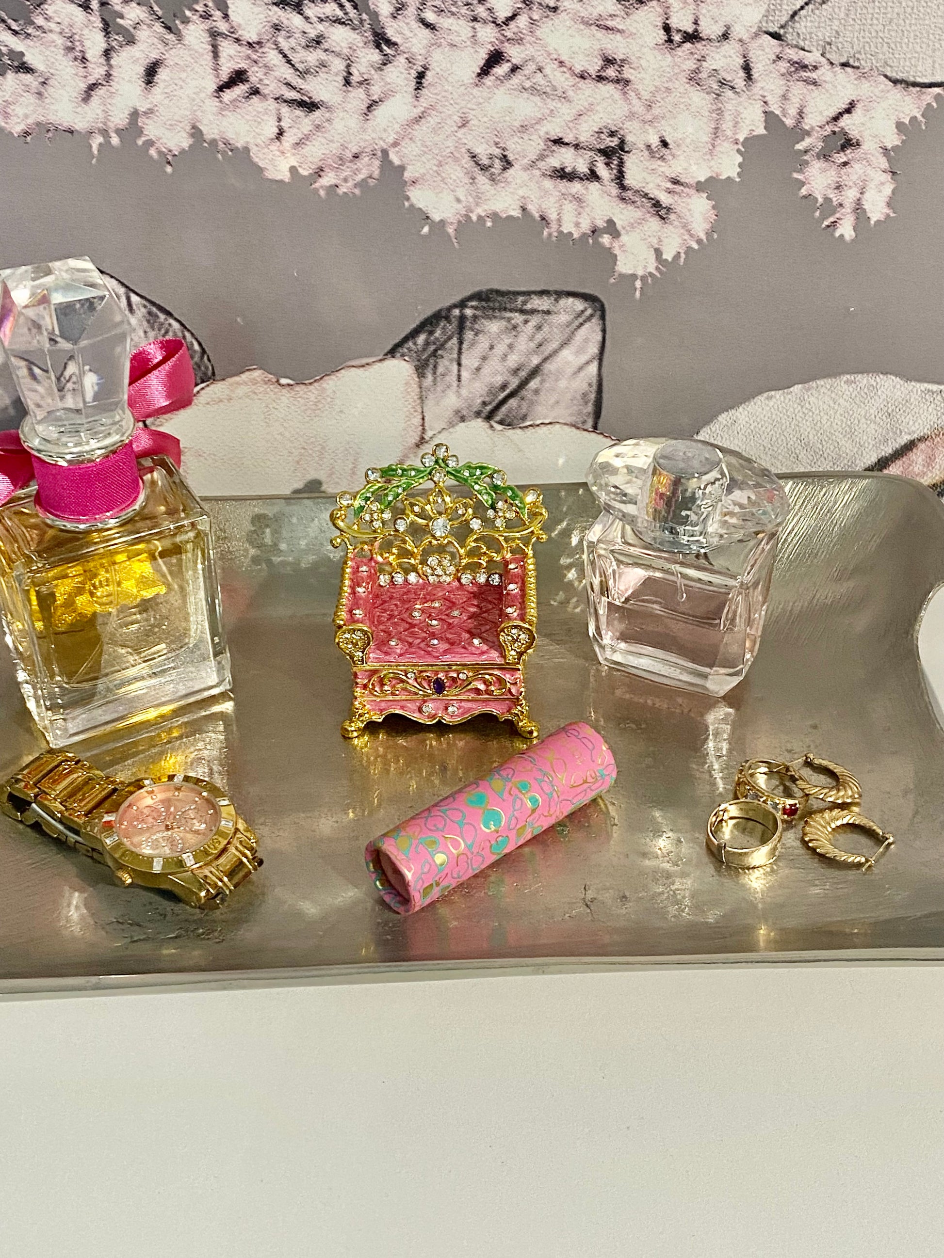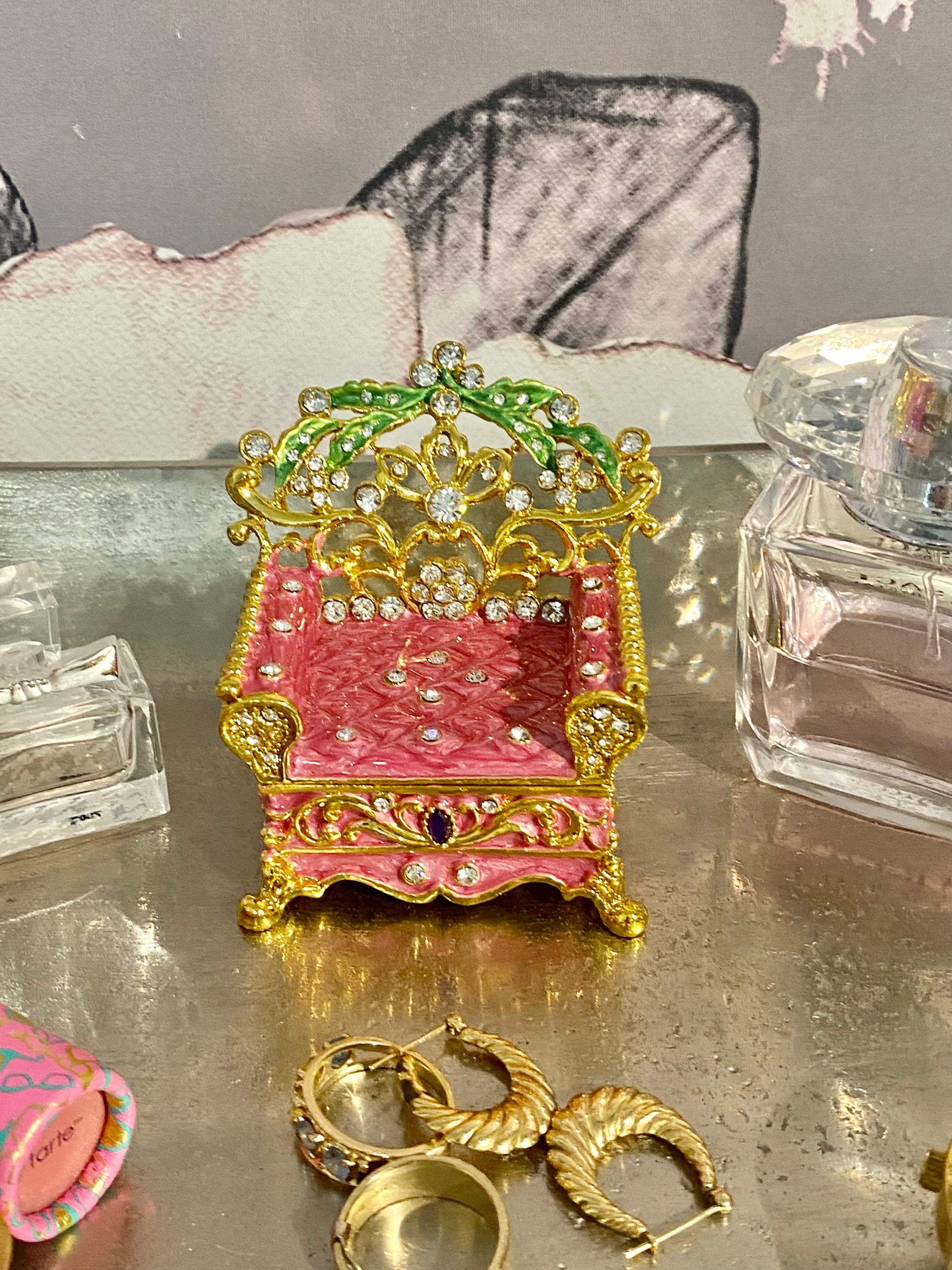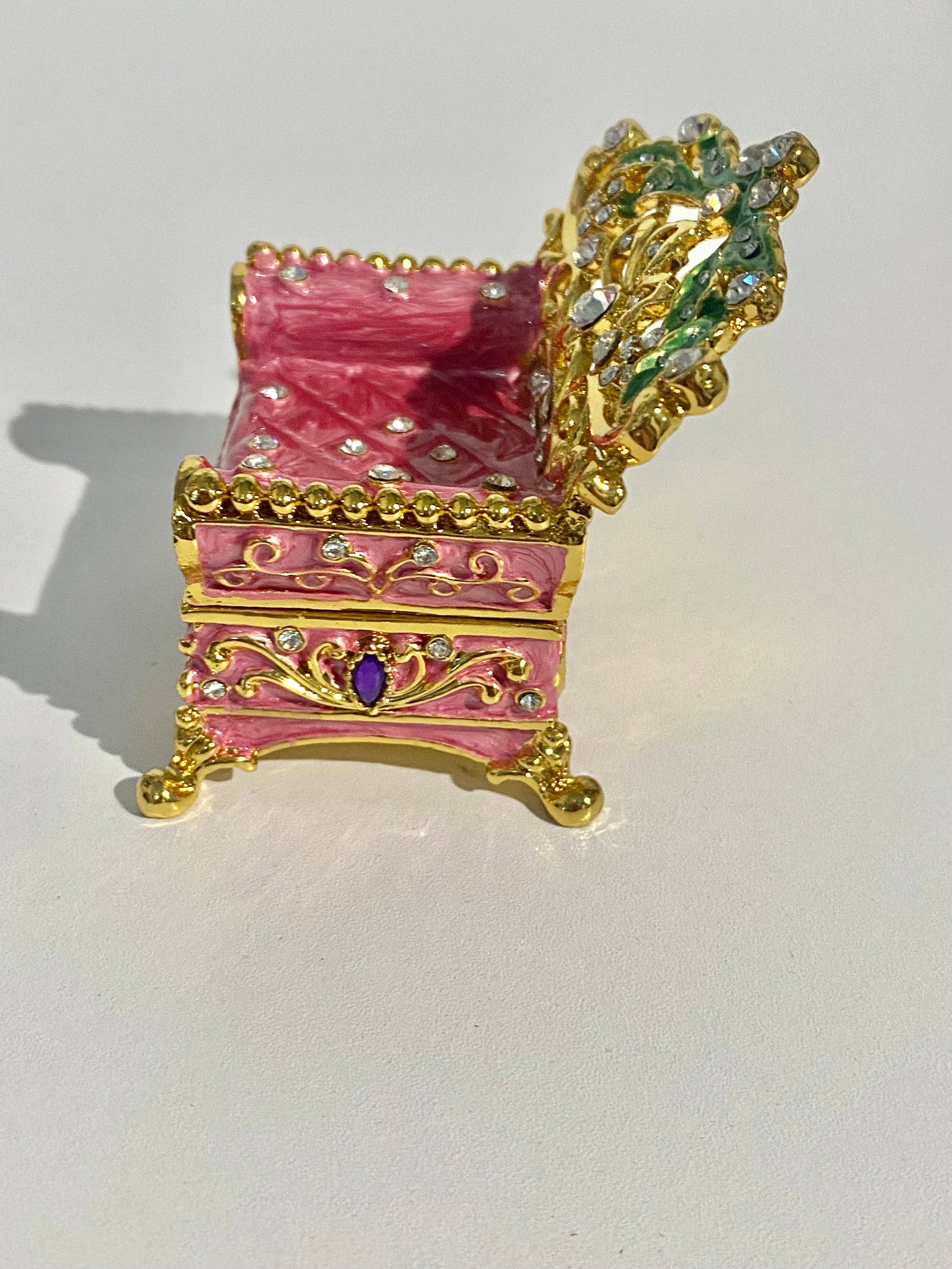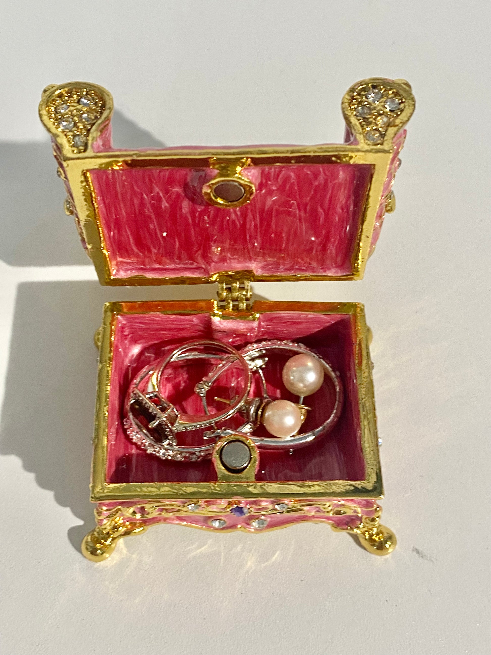 This loveseat shaped trinket box is pretty in pink with amethysts and rhinestones. Keep this box as home décor, store small jewelry or gift to a friend or girlfriend!