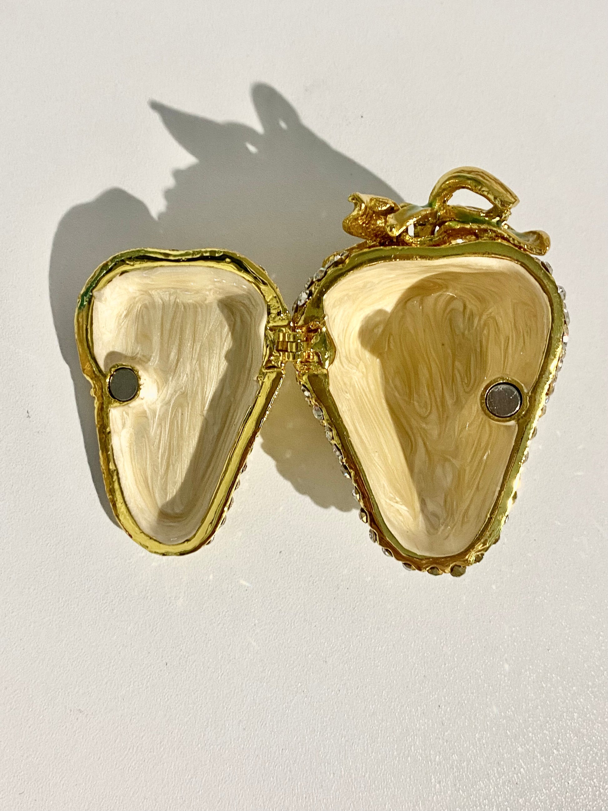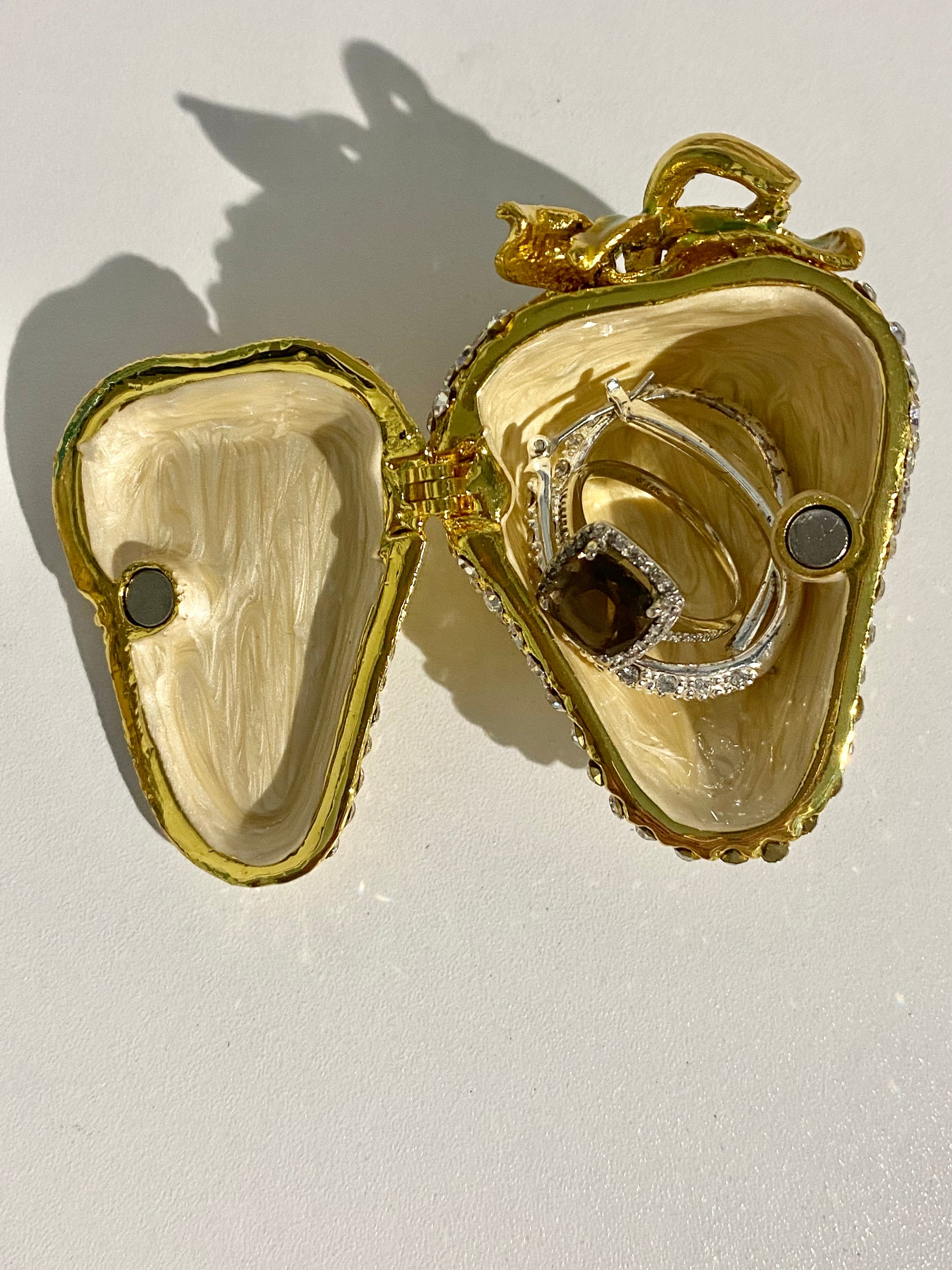 This golden shape strawberry trinket box is covered in crystals. Keep this box as home décor, store small jewelry or gift to a friend or girlfriend!