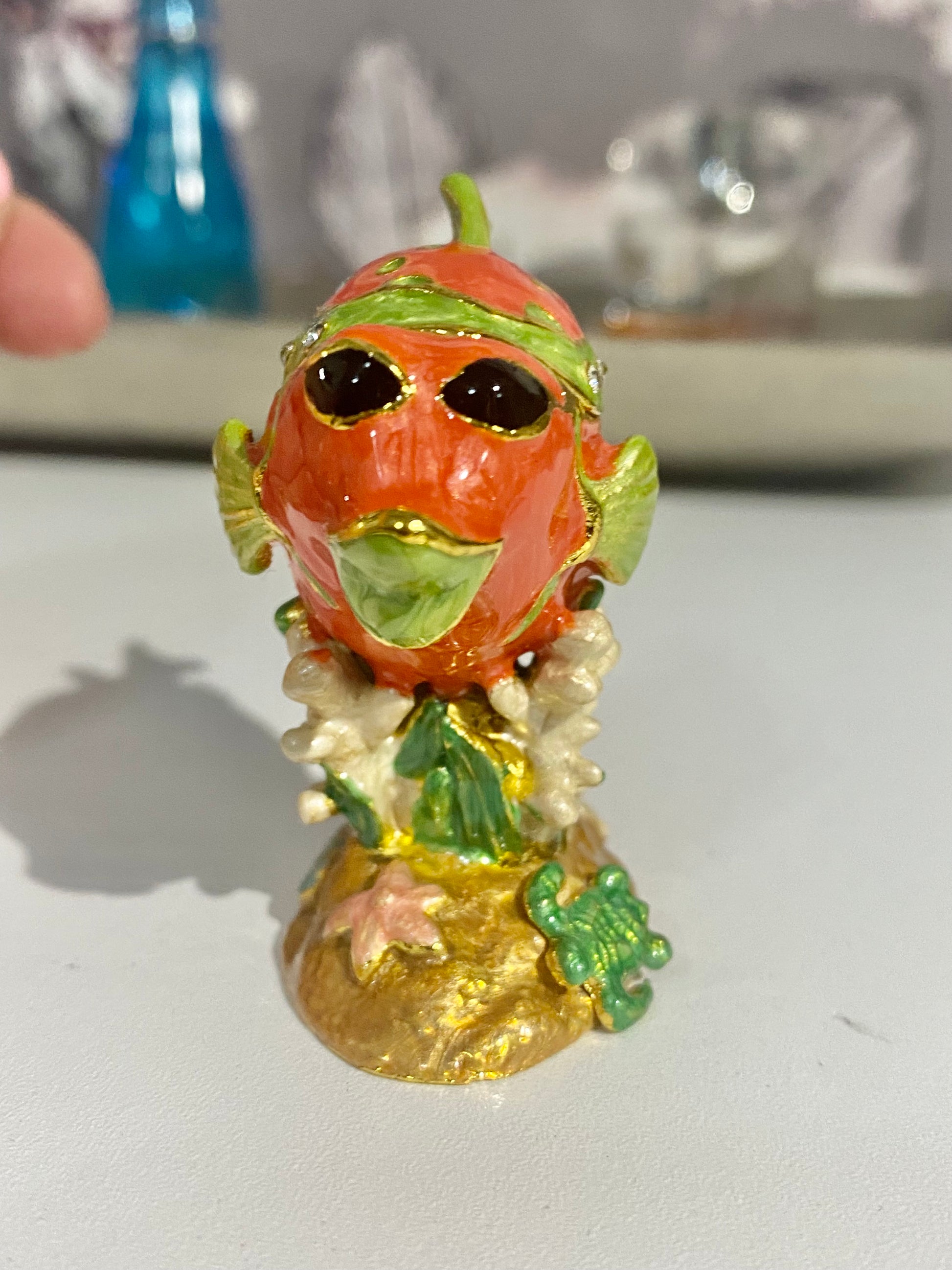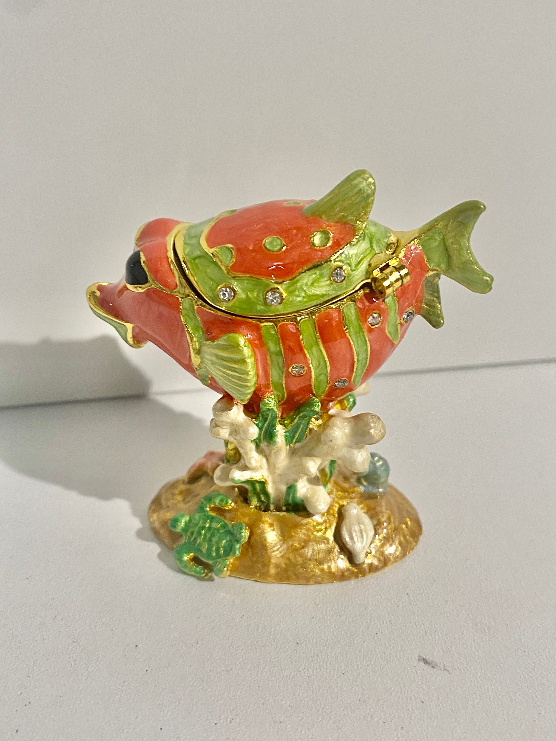 This kissing fish trinket box is colorful and fun with embedded crystals. Keep this box as home décor, store small jewelry or gift to a friend or girlfriend!