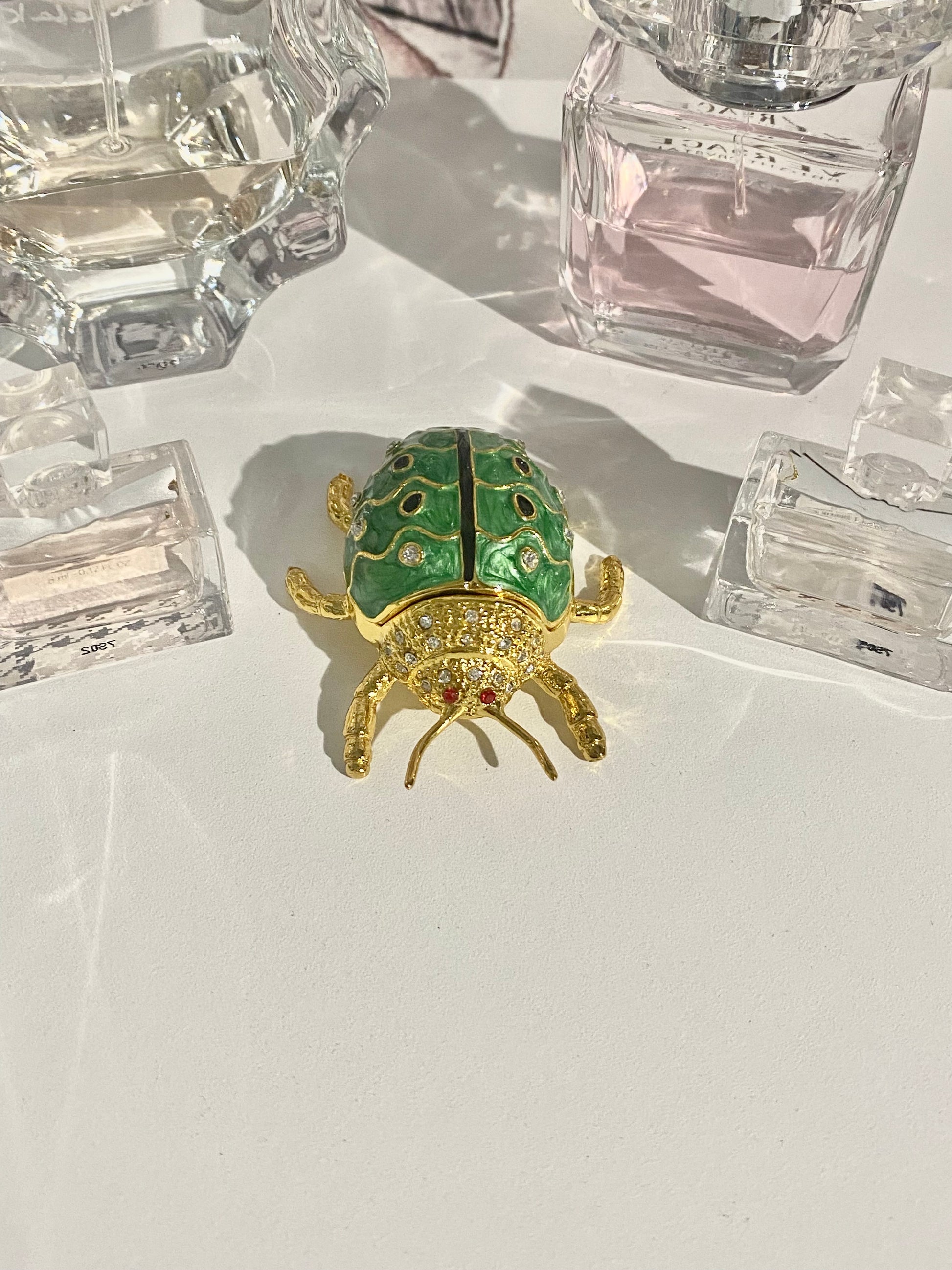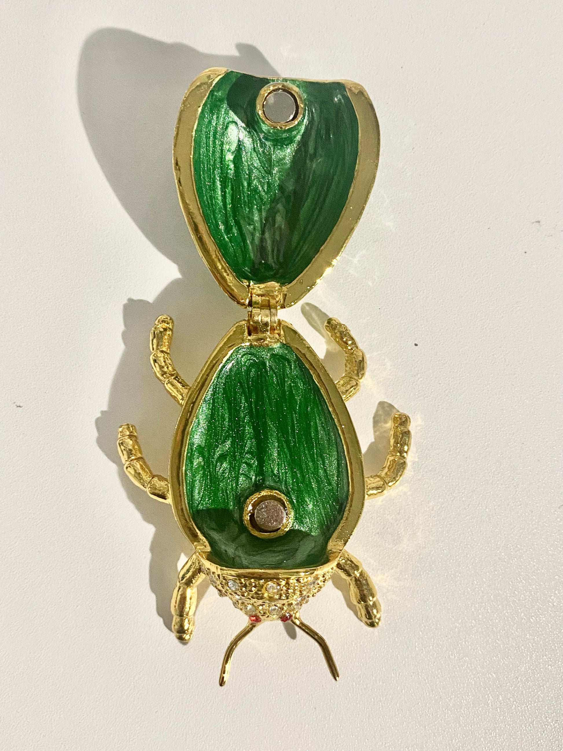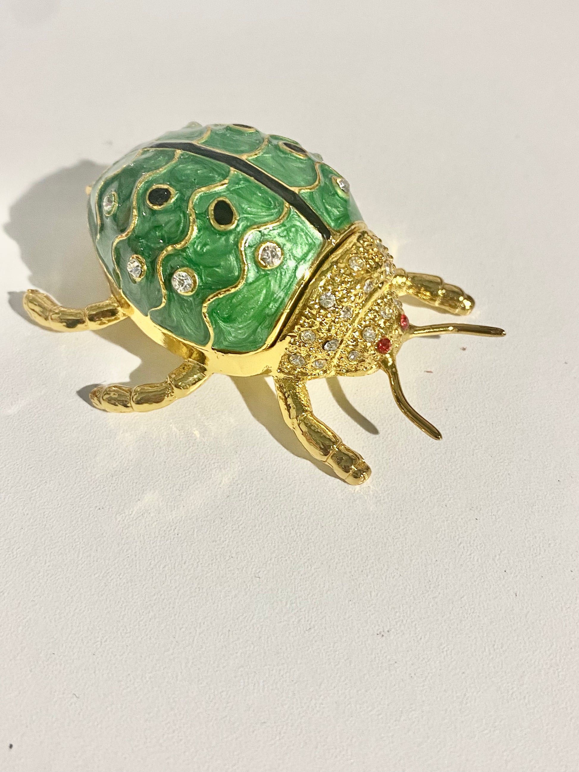 This trinket box features a gold beetle with a green accented back and encrusted jewels. Bright ruby eyes. Keep a ring or small jewelry in this box, gift to a friend or keep as décor!
