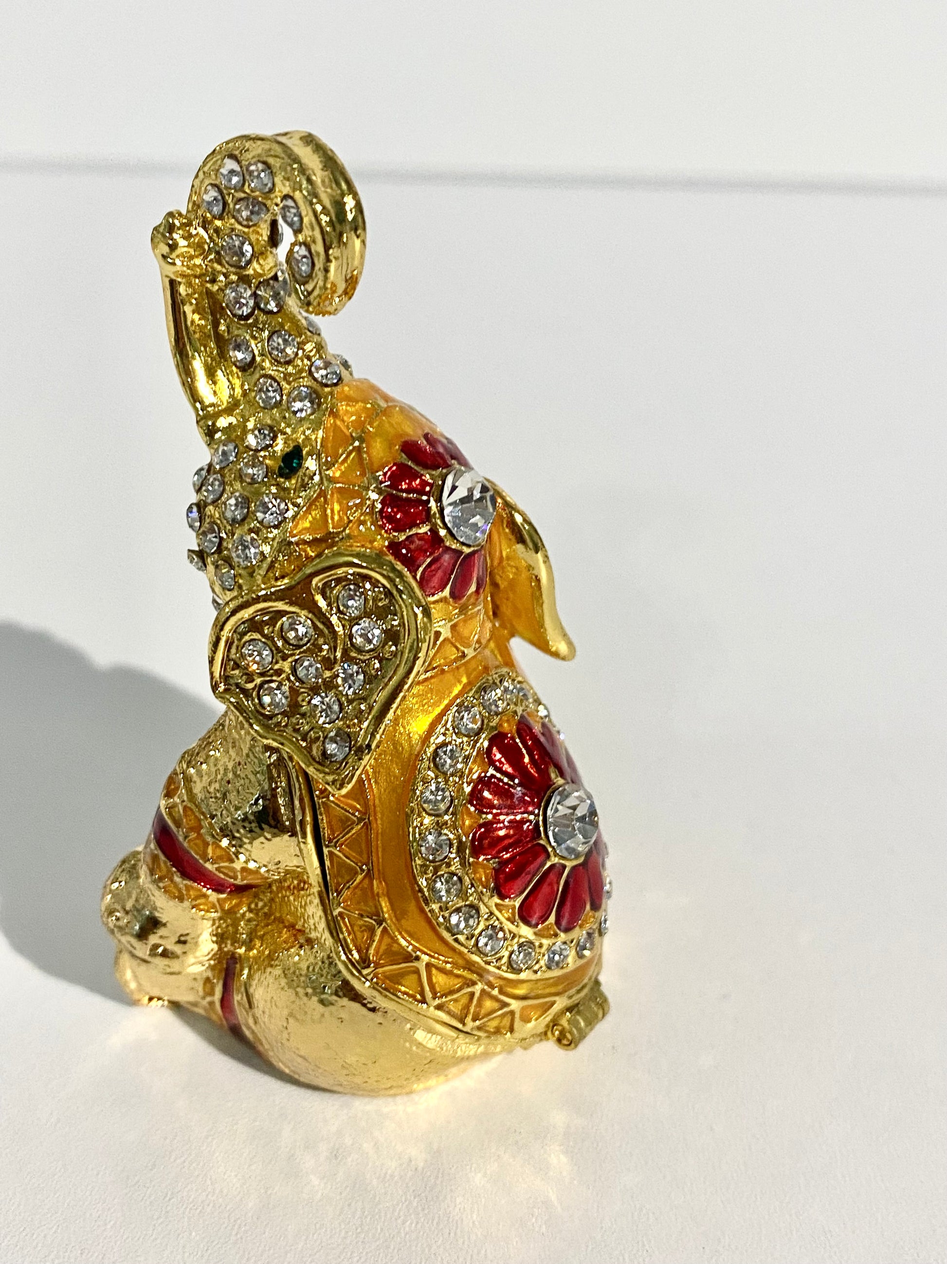 This elephant shaped trinket box in a sitting position is covered in rubies and crystals. Keep this box as home décor, store small jewelry or gift to a friend or girlfriend!