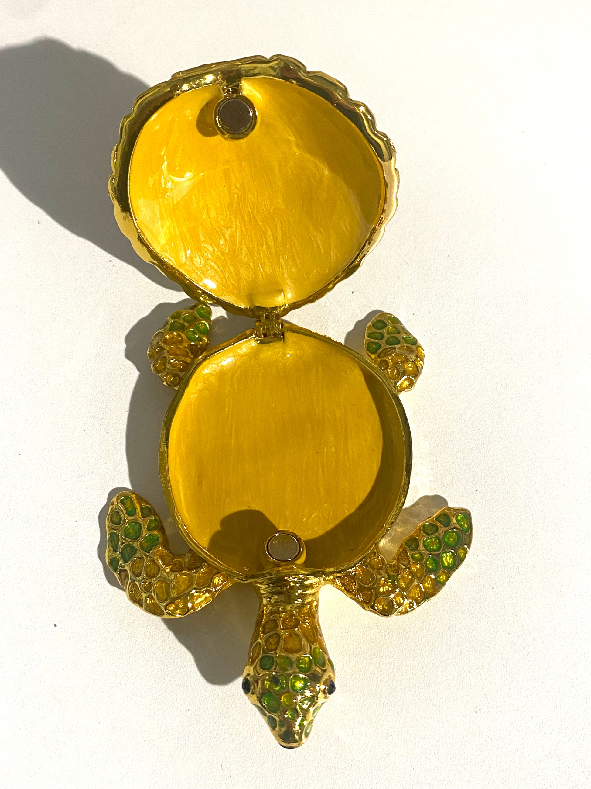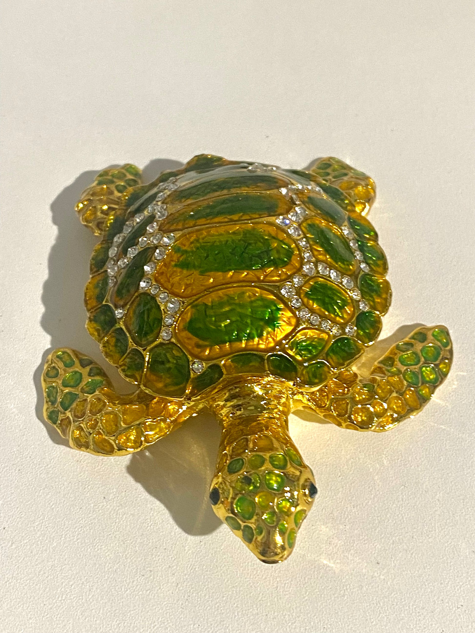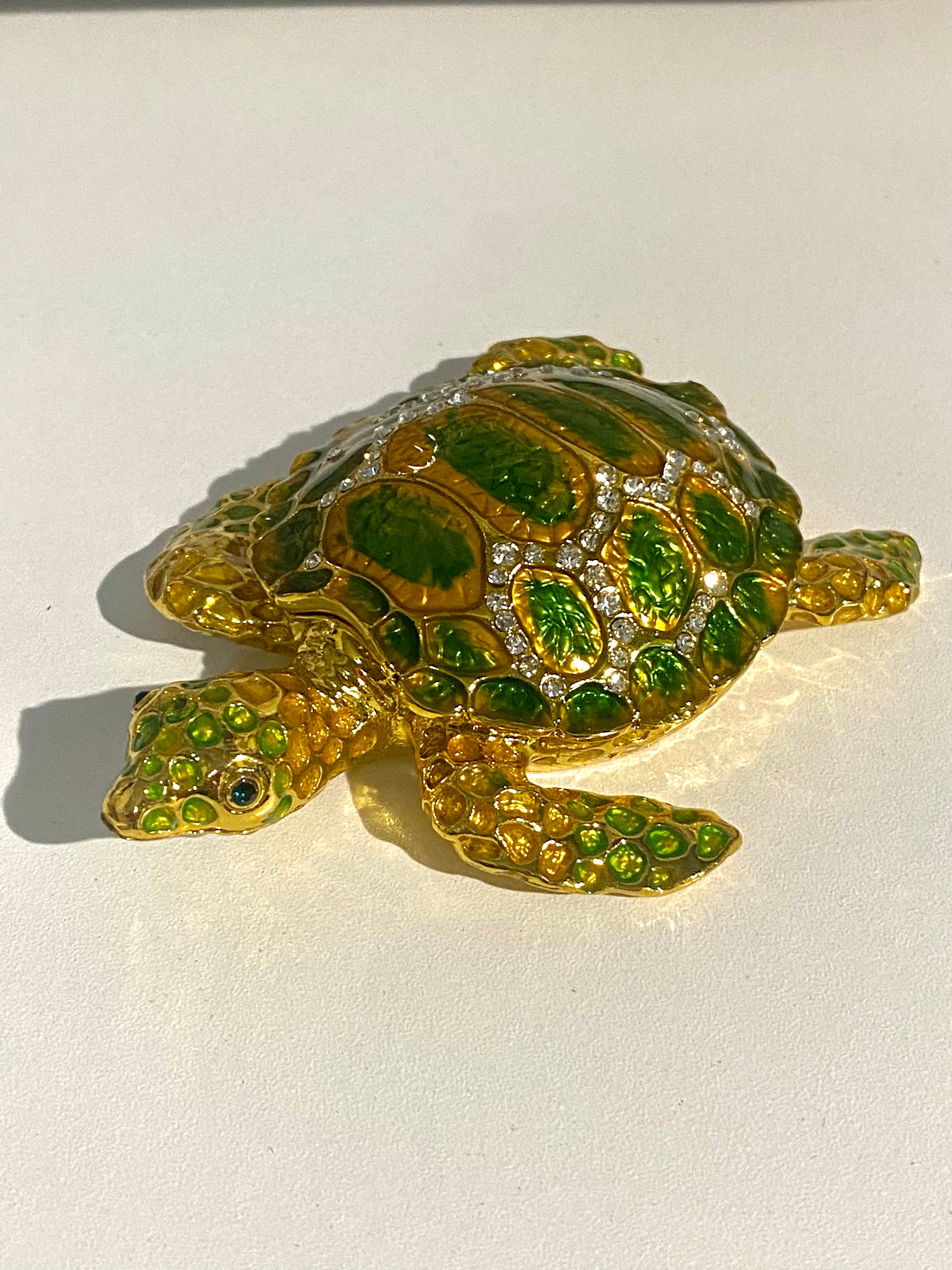 This golden shaped sea turtle trinket box features emerald gems all over the shell with rhinestones. Keep this box as home décor, store small jewelry or gift to a friend or girlfriend!