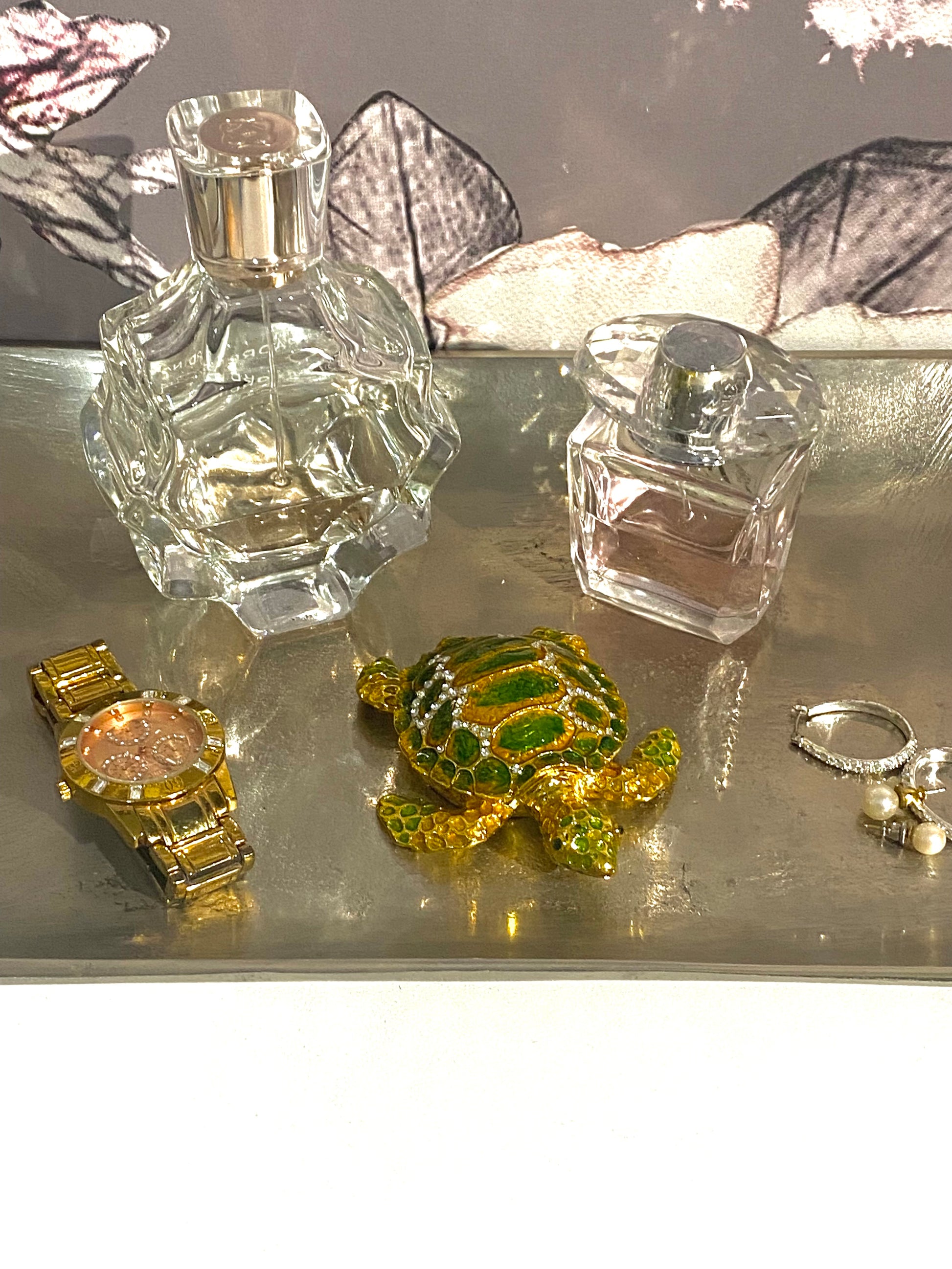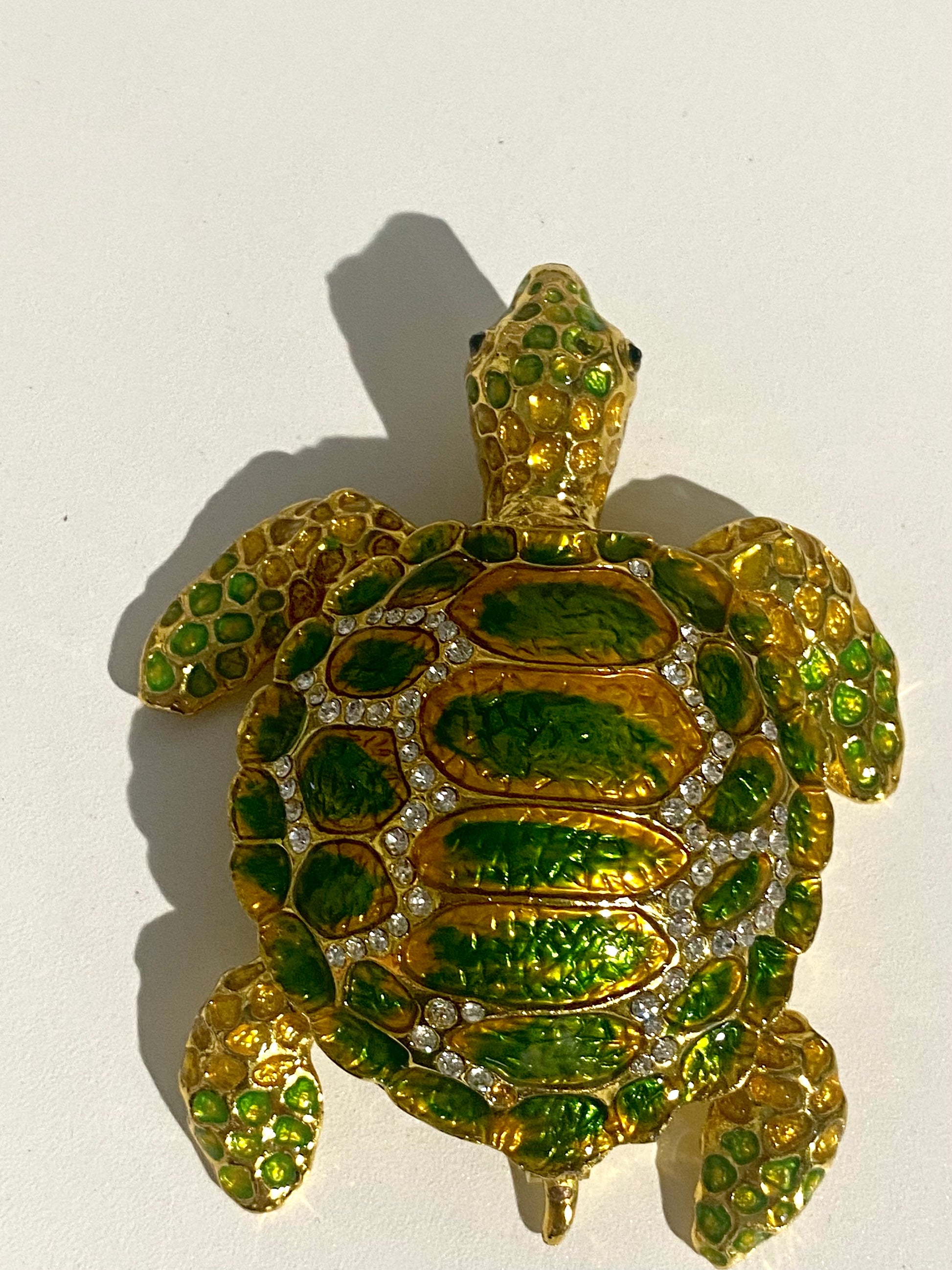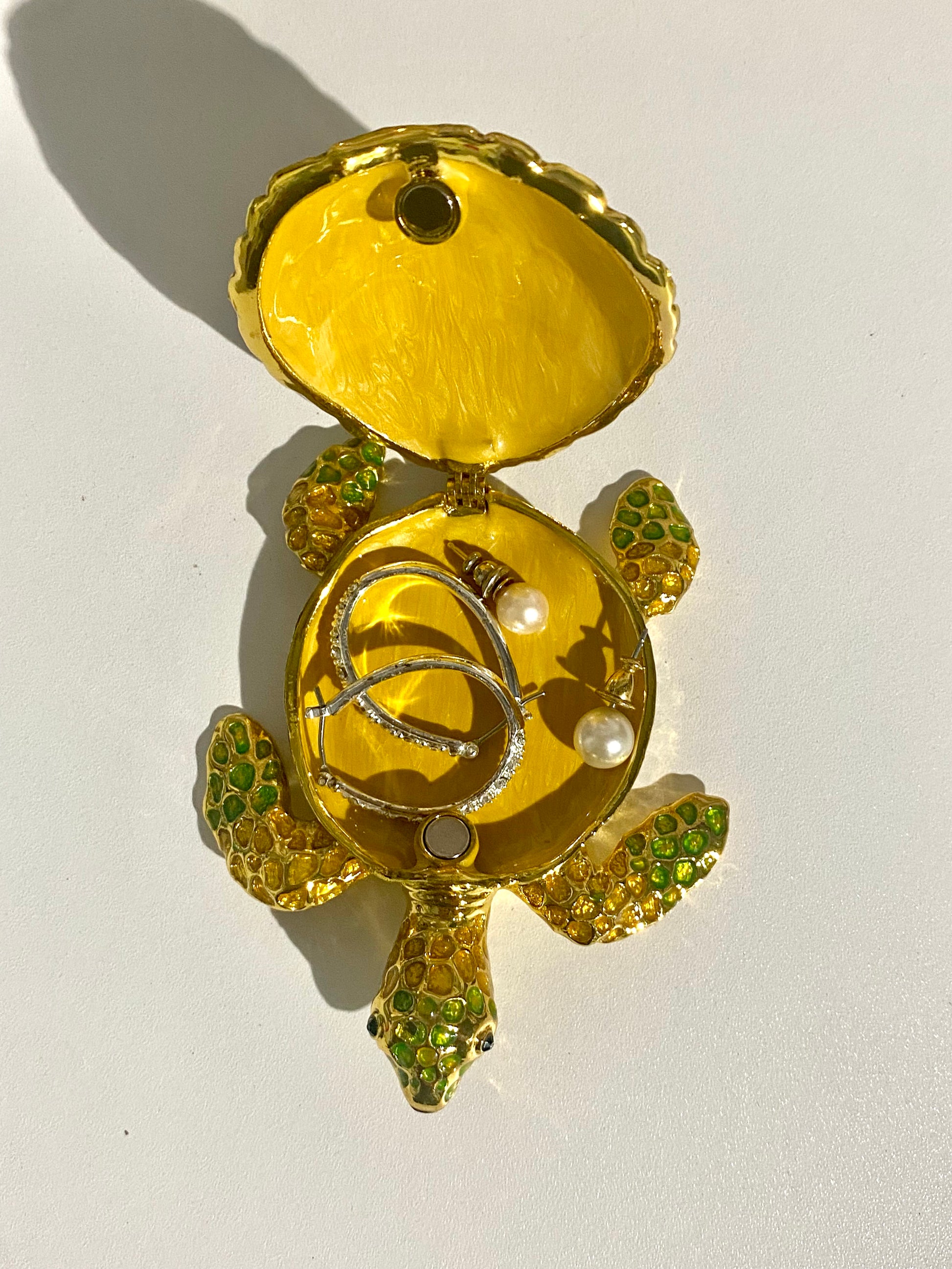 This golden shaped sea turtle trinket box features emerald gems all over the shell with rhinestones. Keep this box as home décor, store small jewelry or gift to a friend or girlfriend!