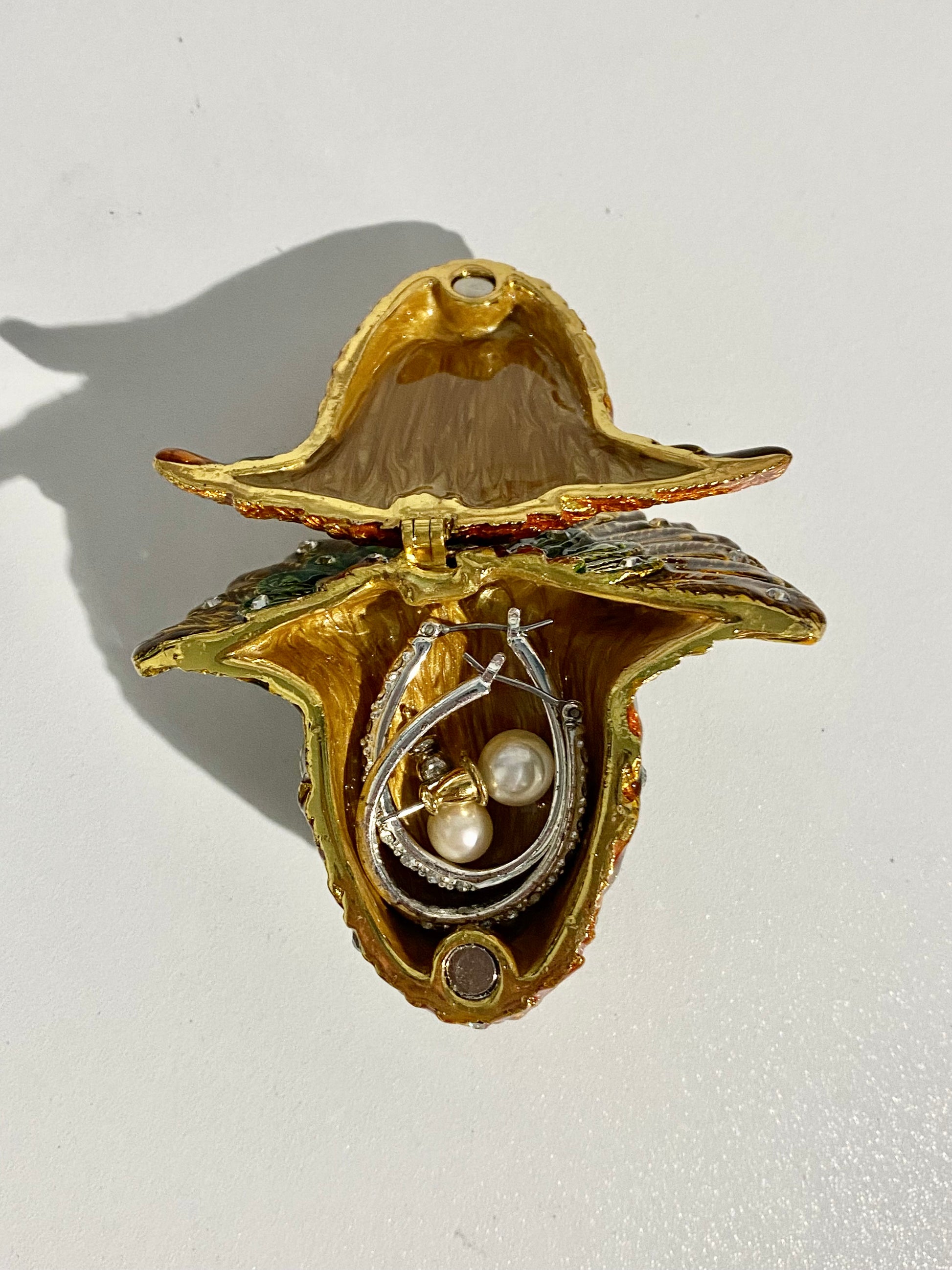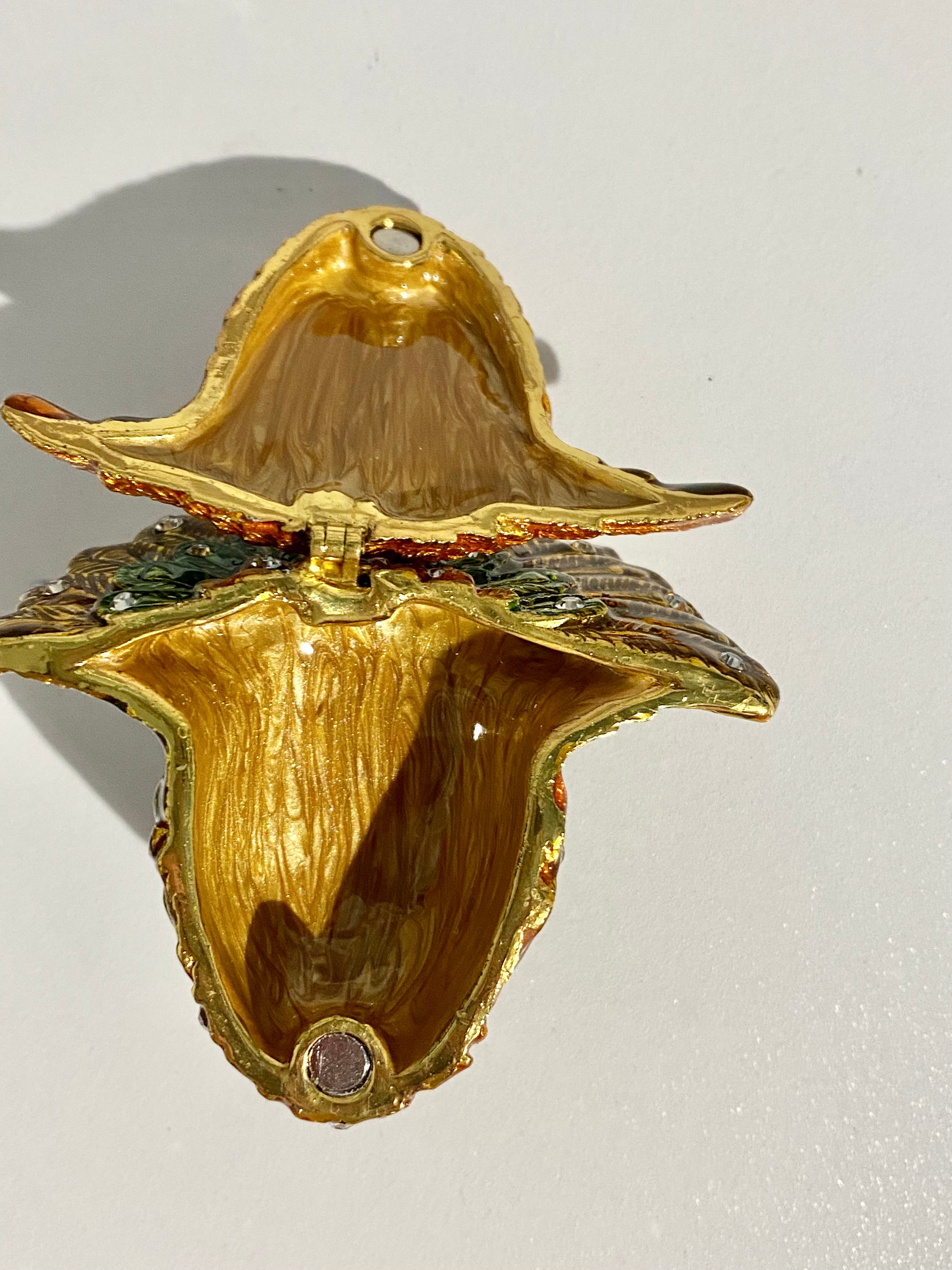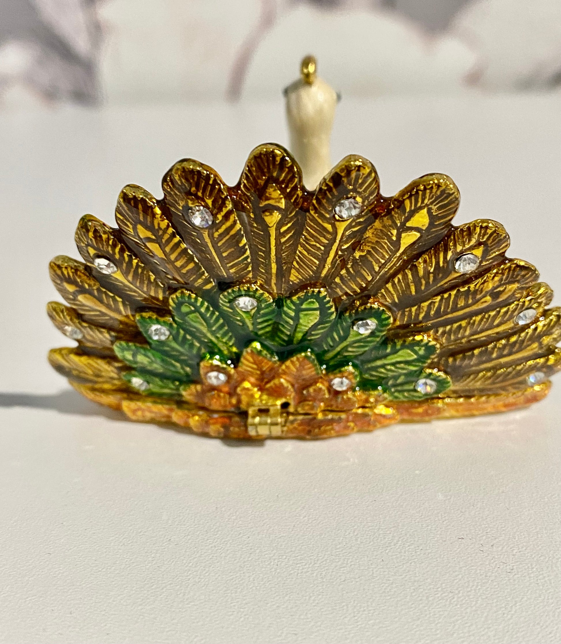 This magnificent turkey trinket box features open feathers encrusted with gems and stunning emerald eyes. Keep this box as home décor, store small jewelry or gift to a friend or girlfriend!