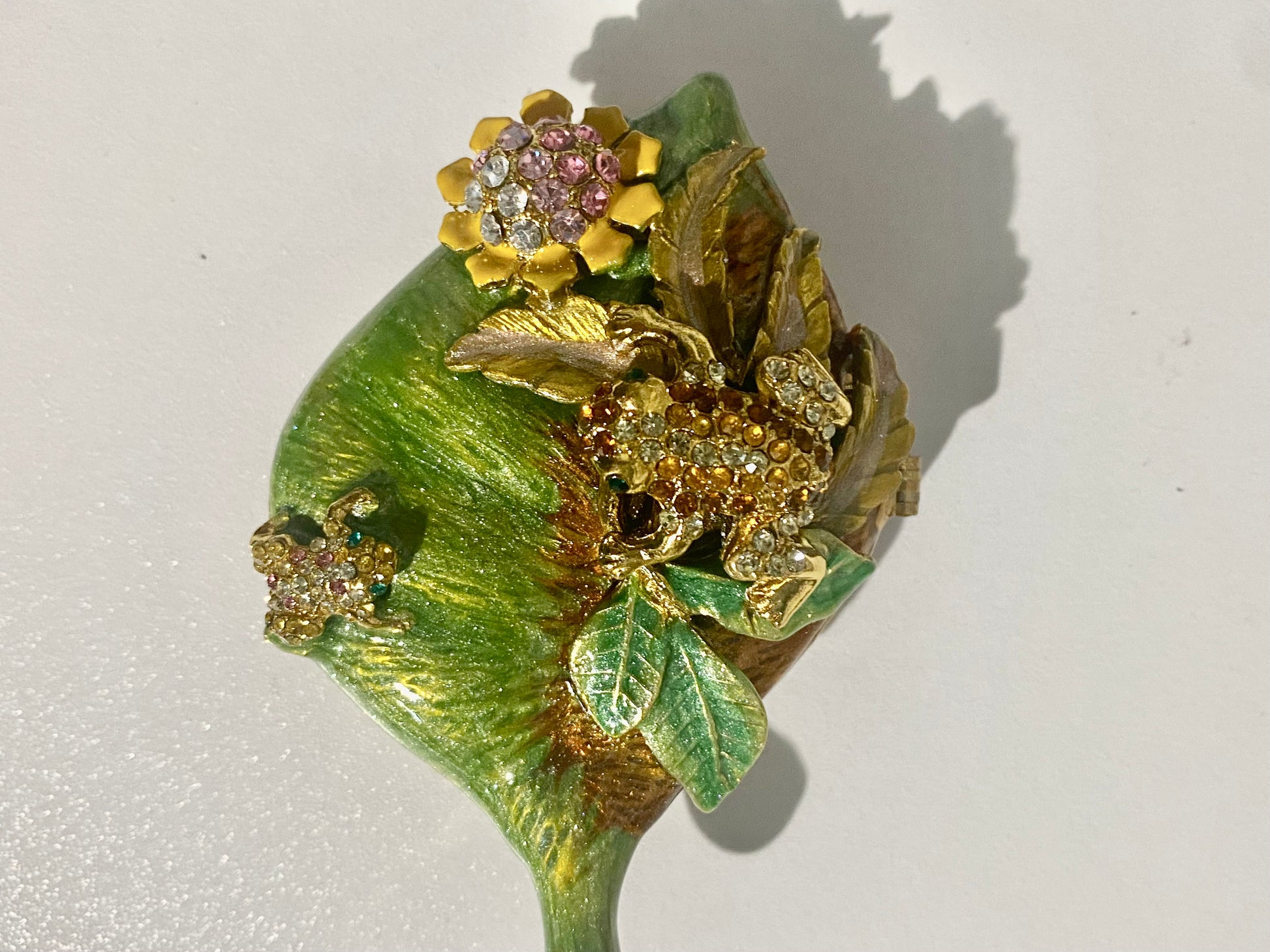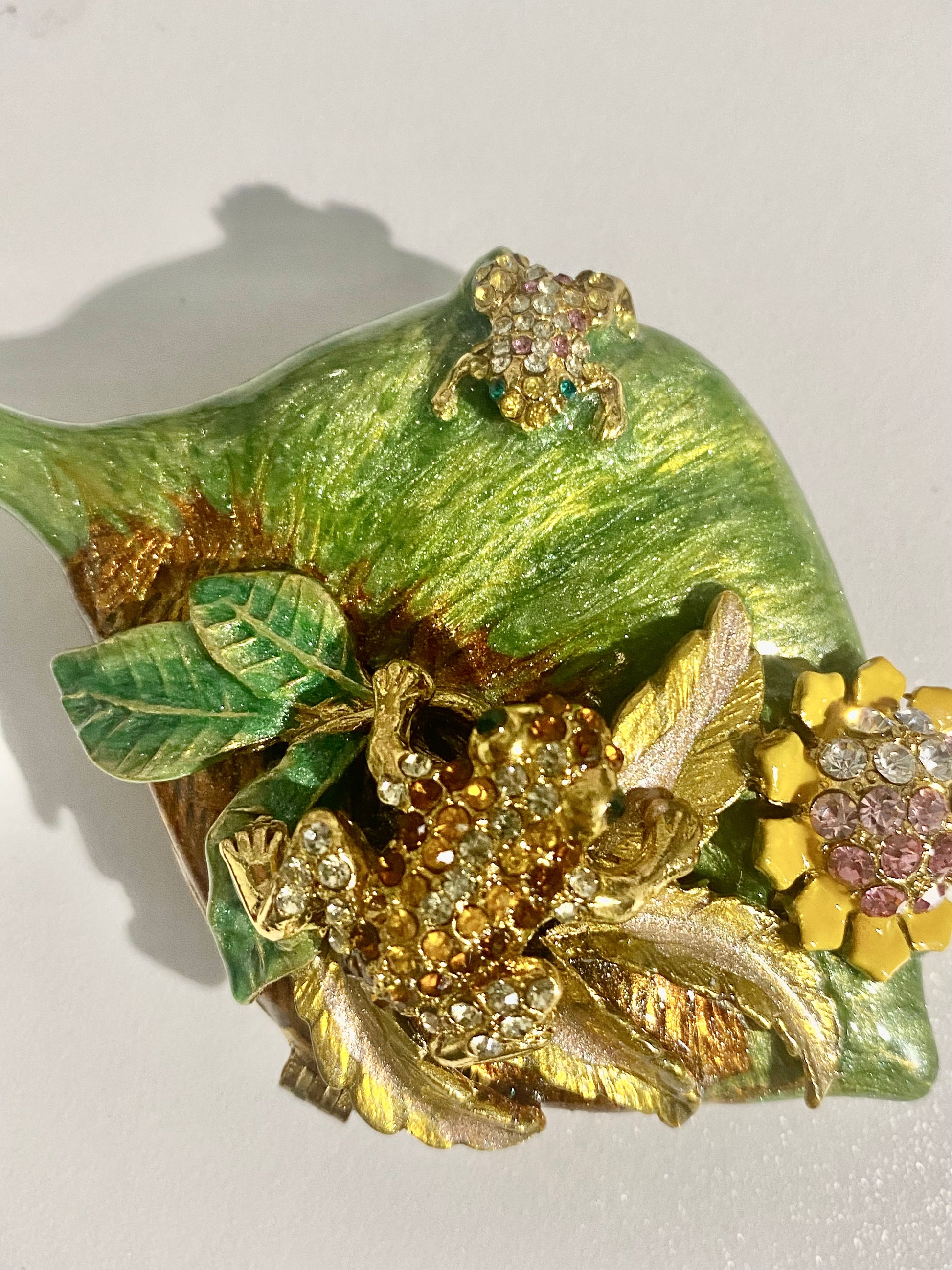 This trinket box features a frog and baby frog. They both are covered in amethyst and amber encrusted gems with emerald eyes sitting on a leaf with yellow flowers. Keep this box as home décor, store small jewelry or gift to a friend or girlfriend!