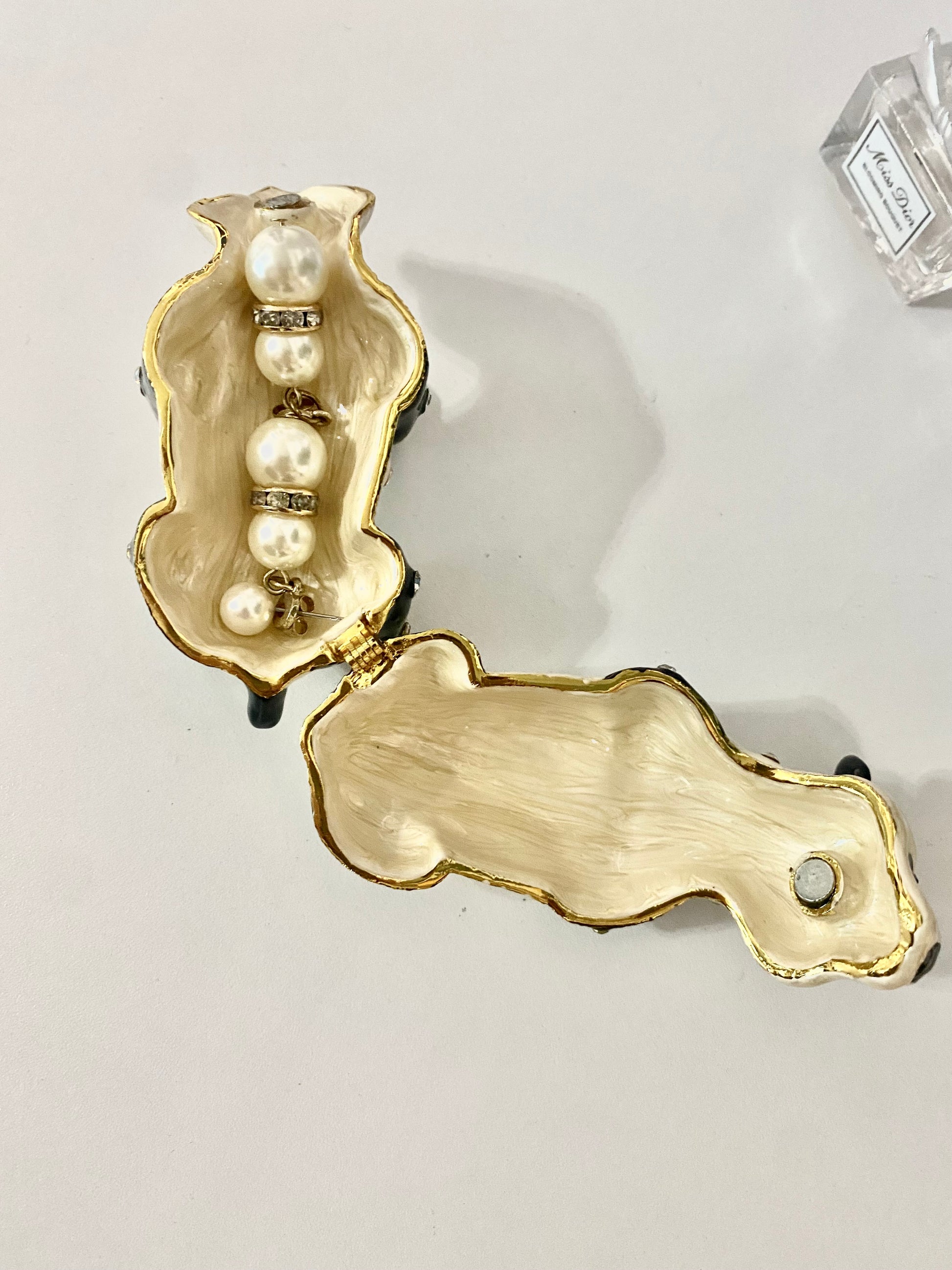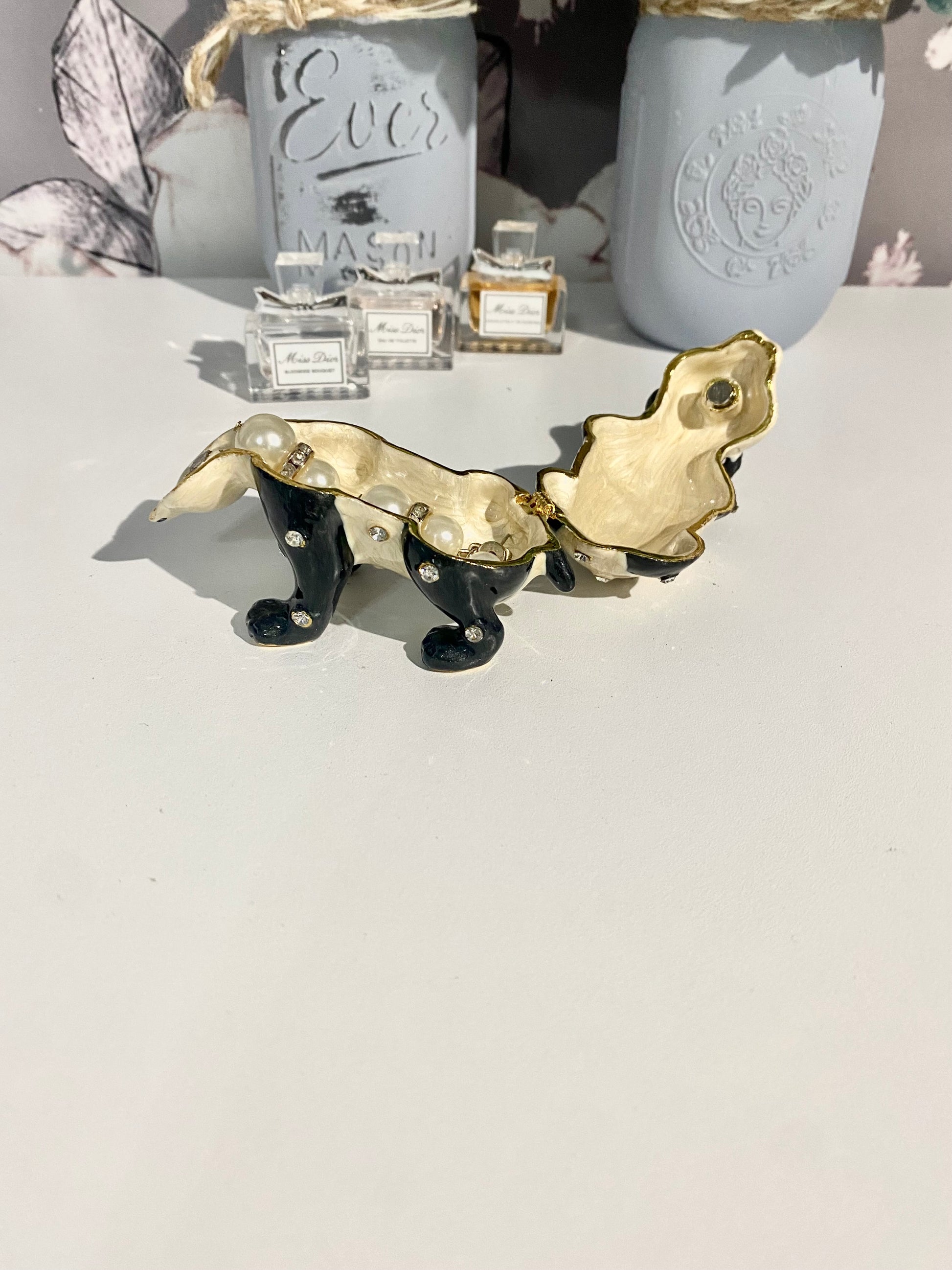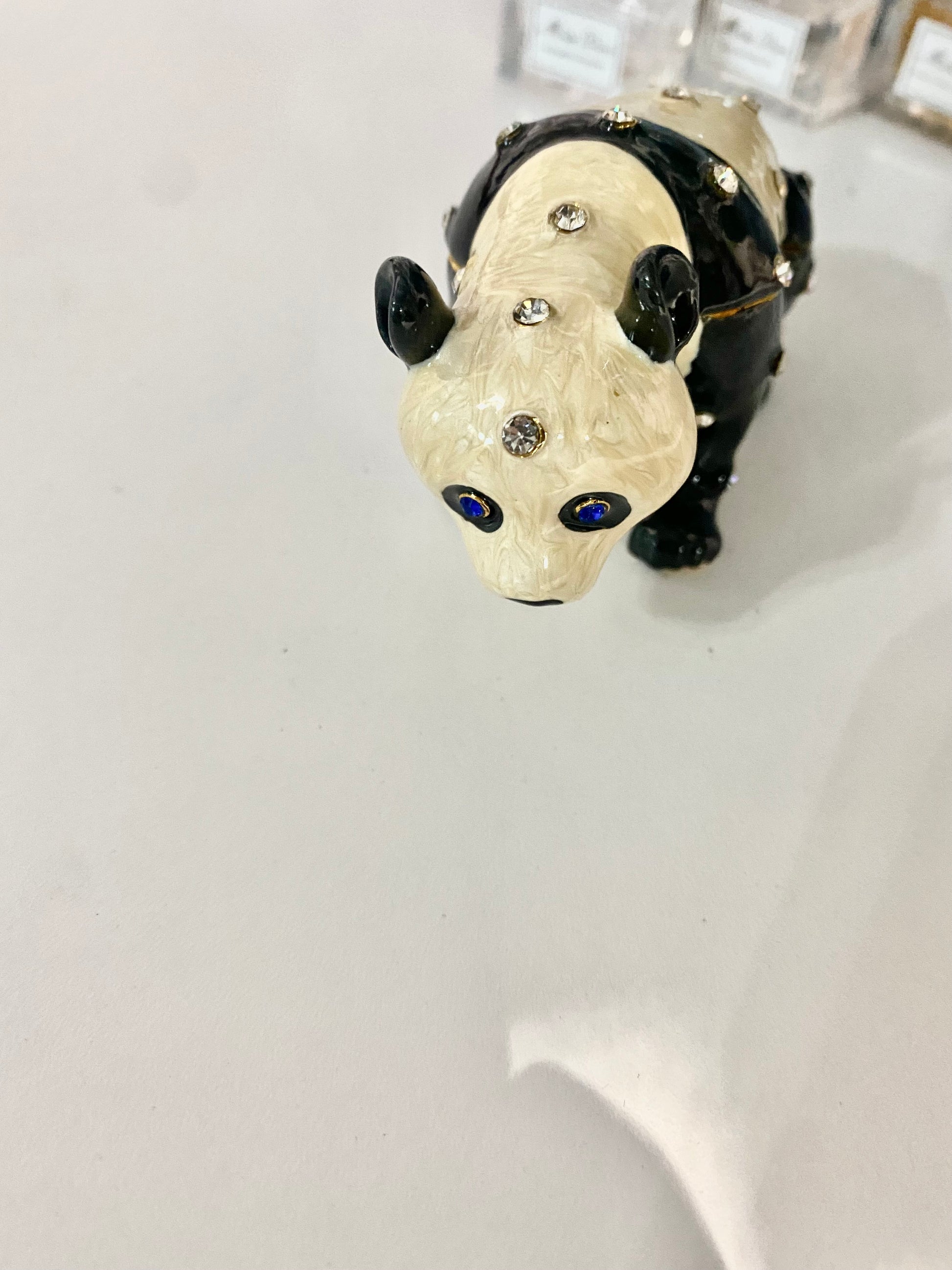 This panda bear trinket box has sapphire eyes and is encrusted with crystals. Keep a ring or small jewelry in this box, gift to a friend or keep as décor!