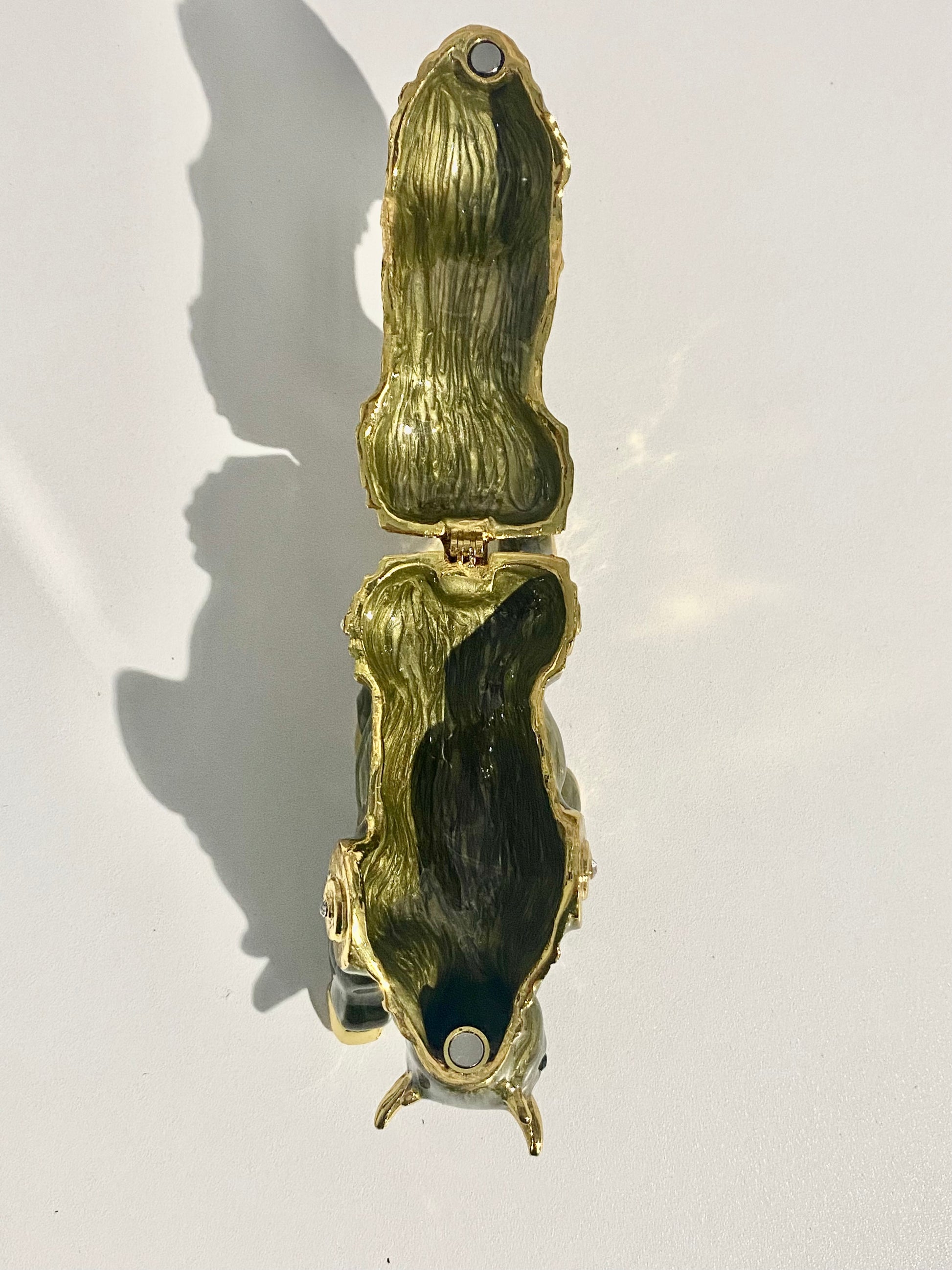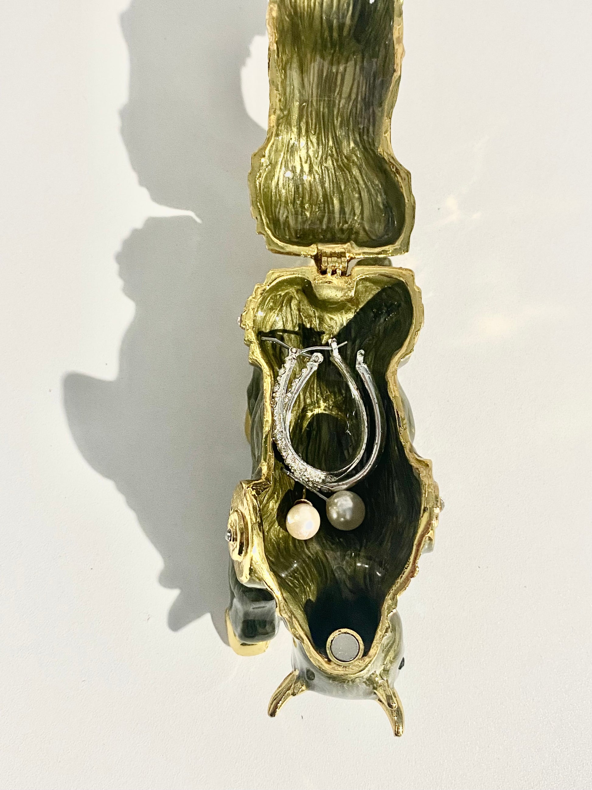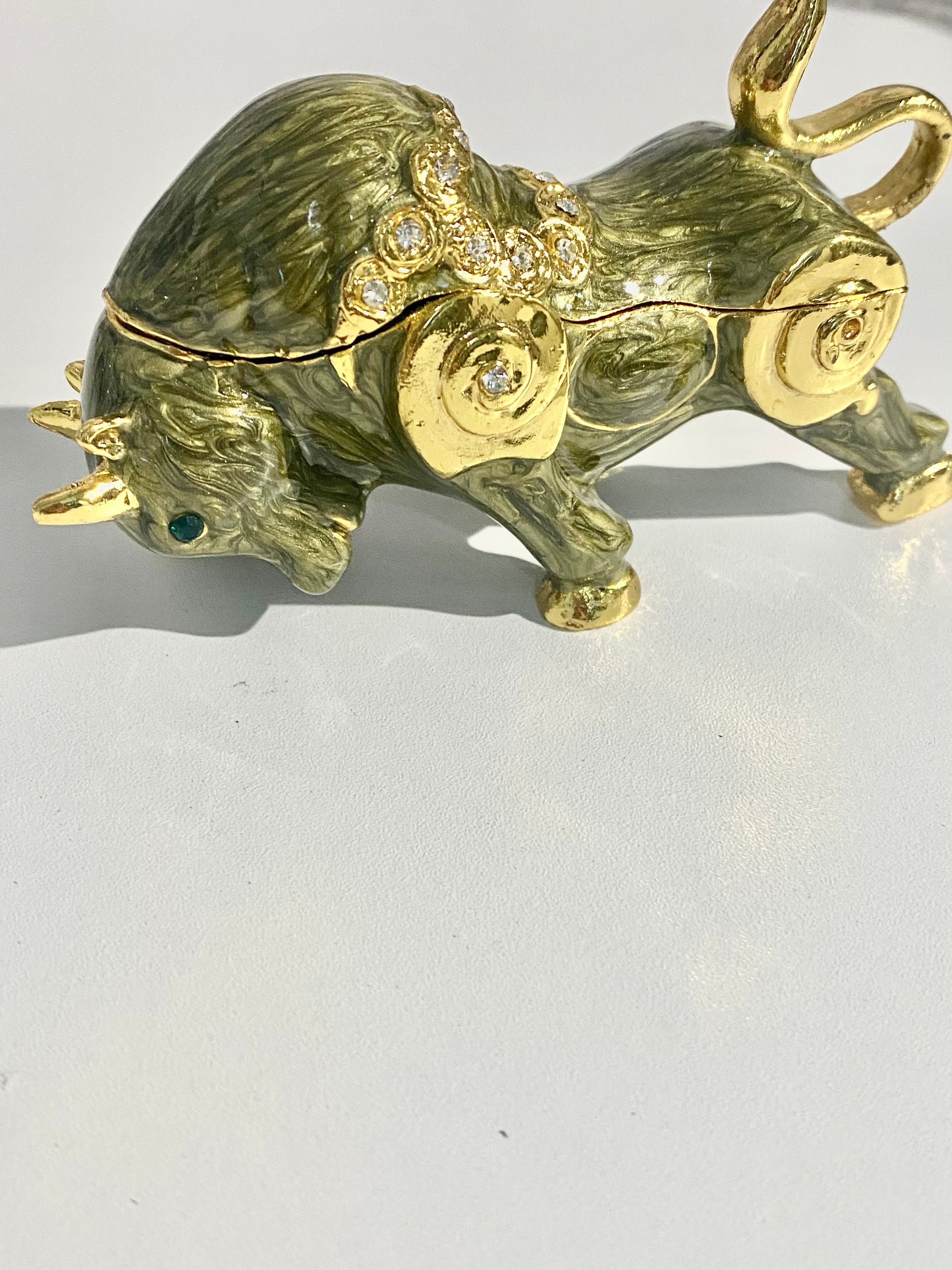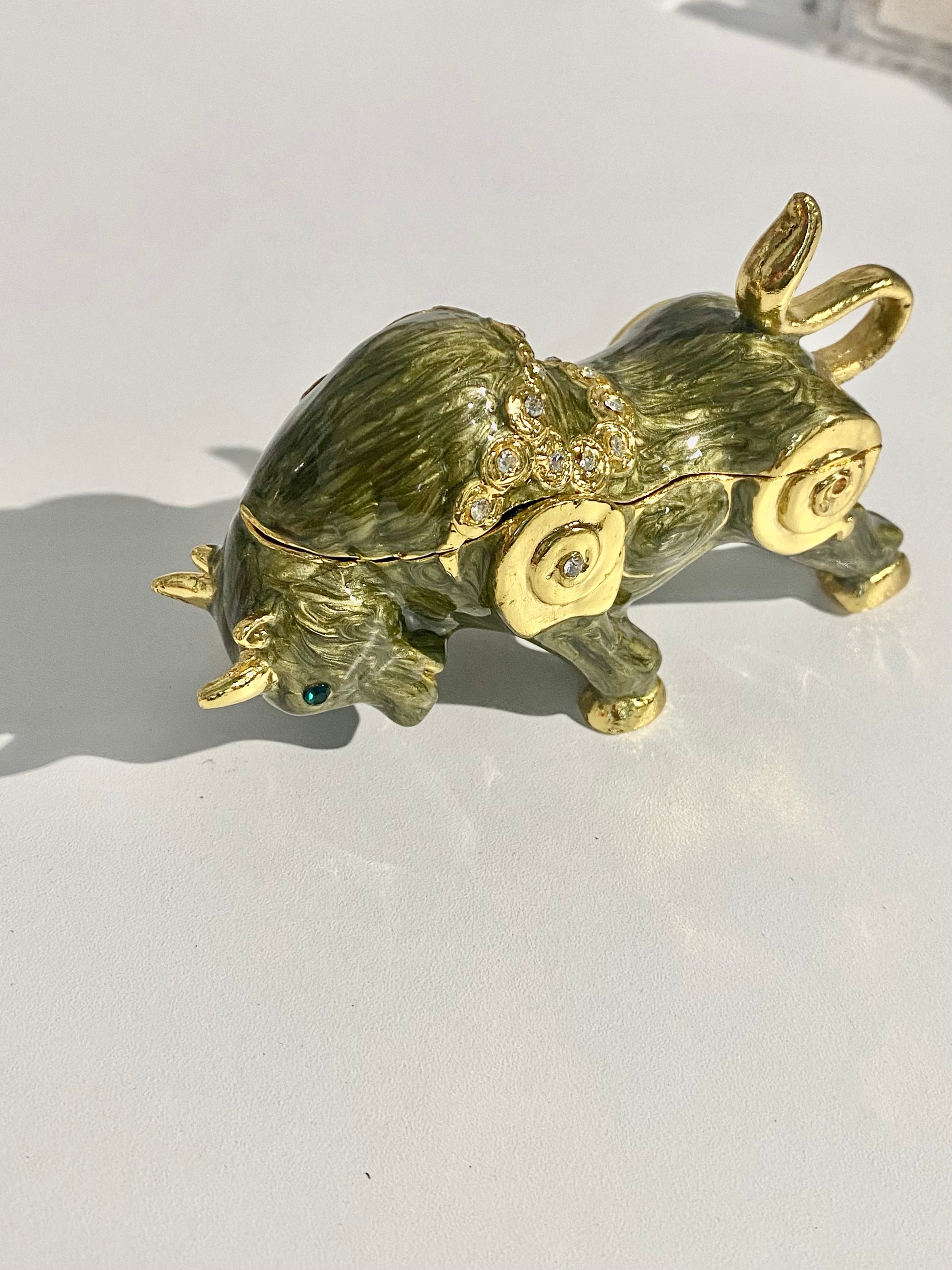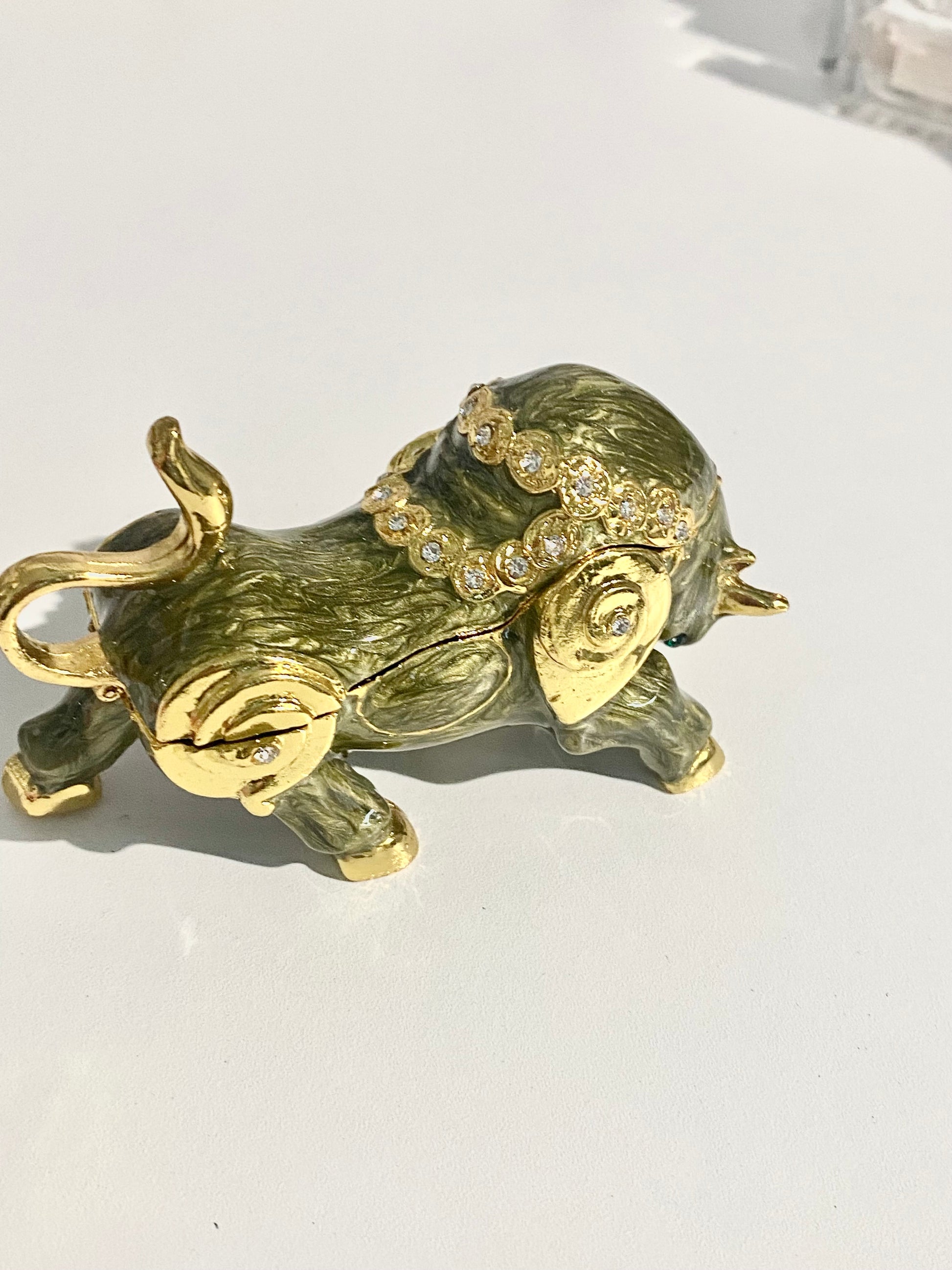 This trinket box features a gold charging bull with emerald eyes and crystals down its back. Keep this box as home décor, store small jewelry or gift to a friend or girlfriend!