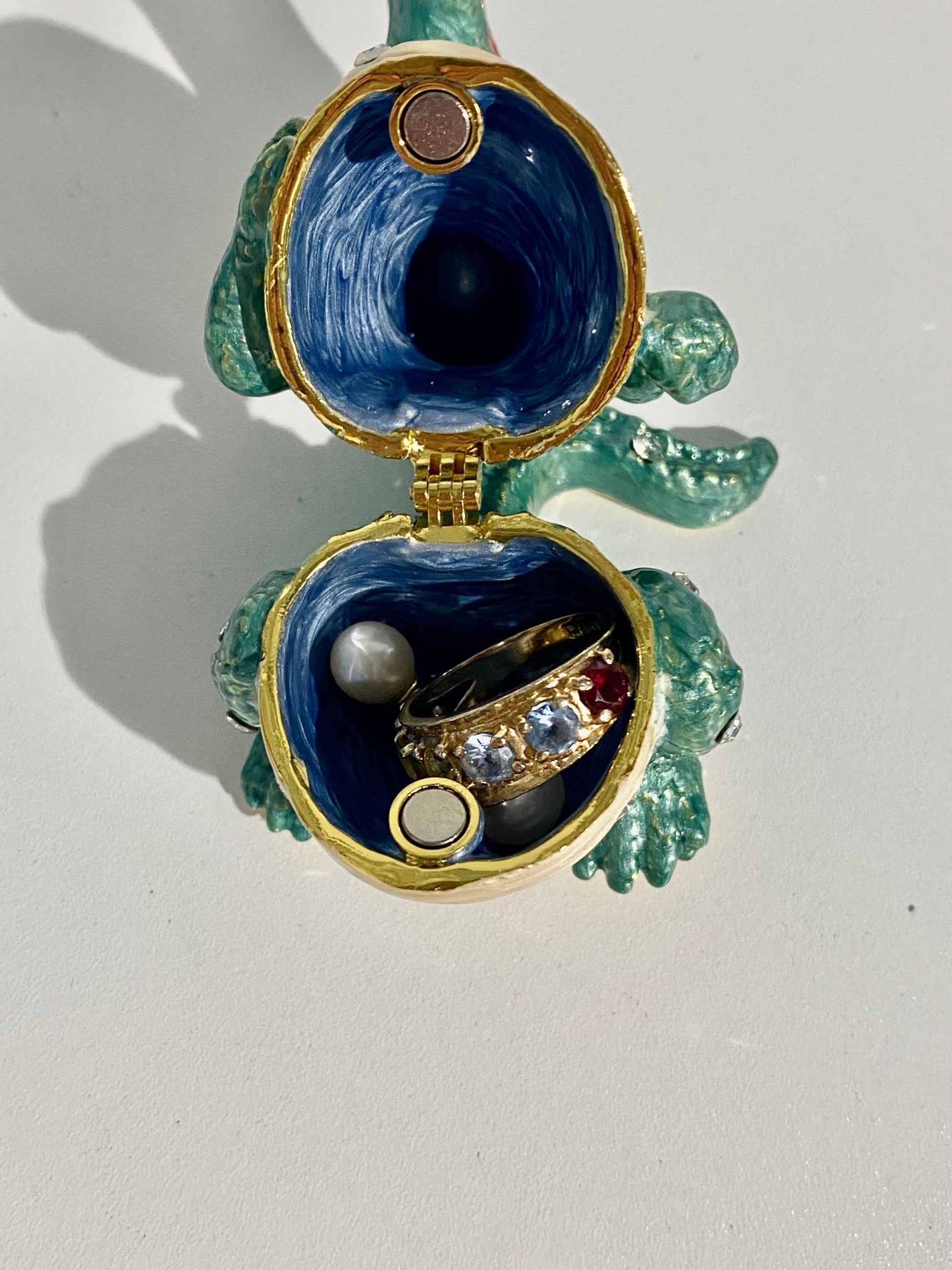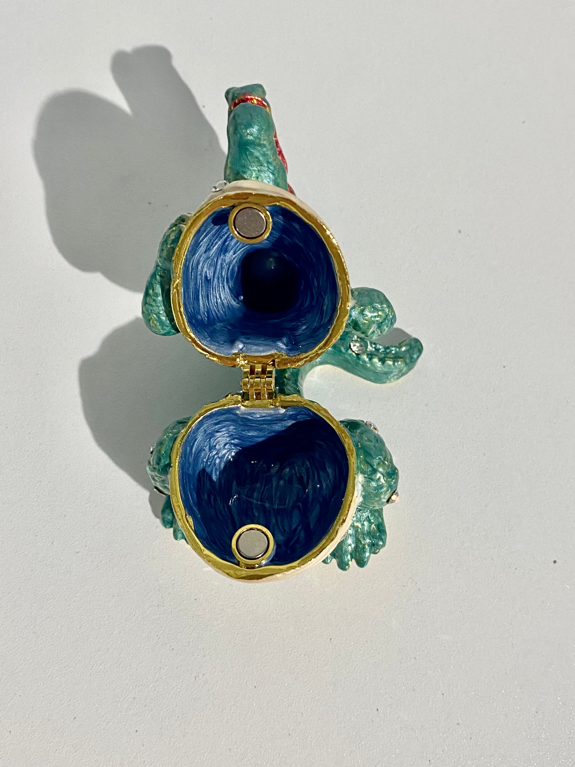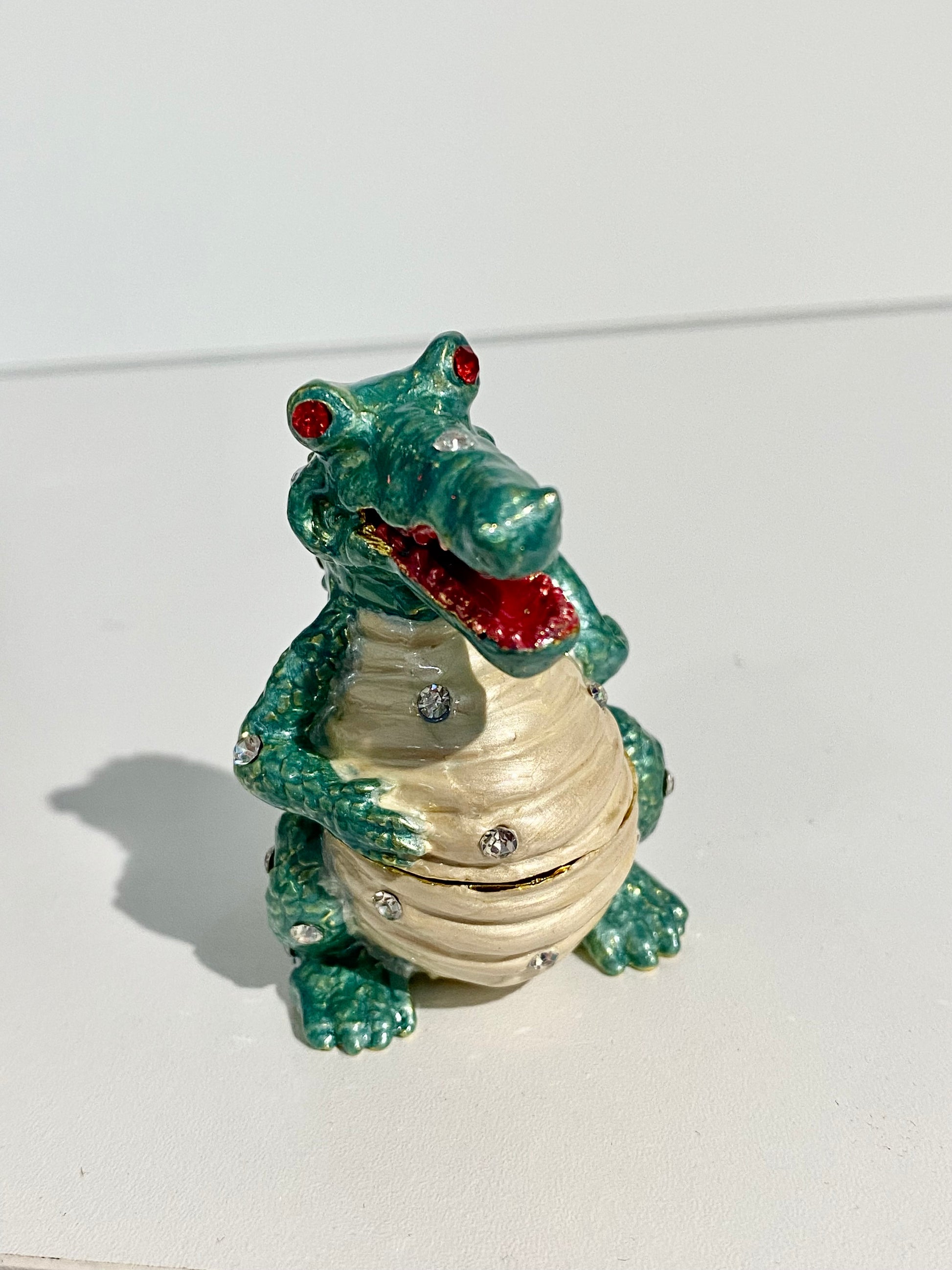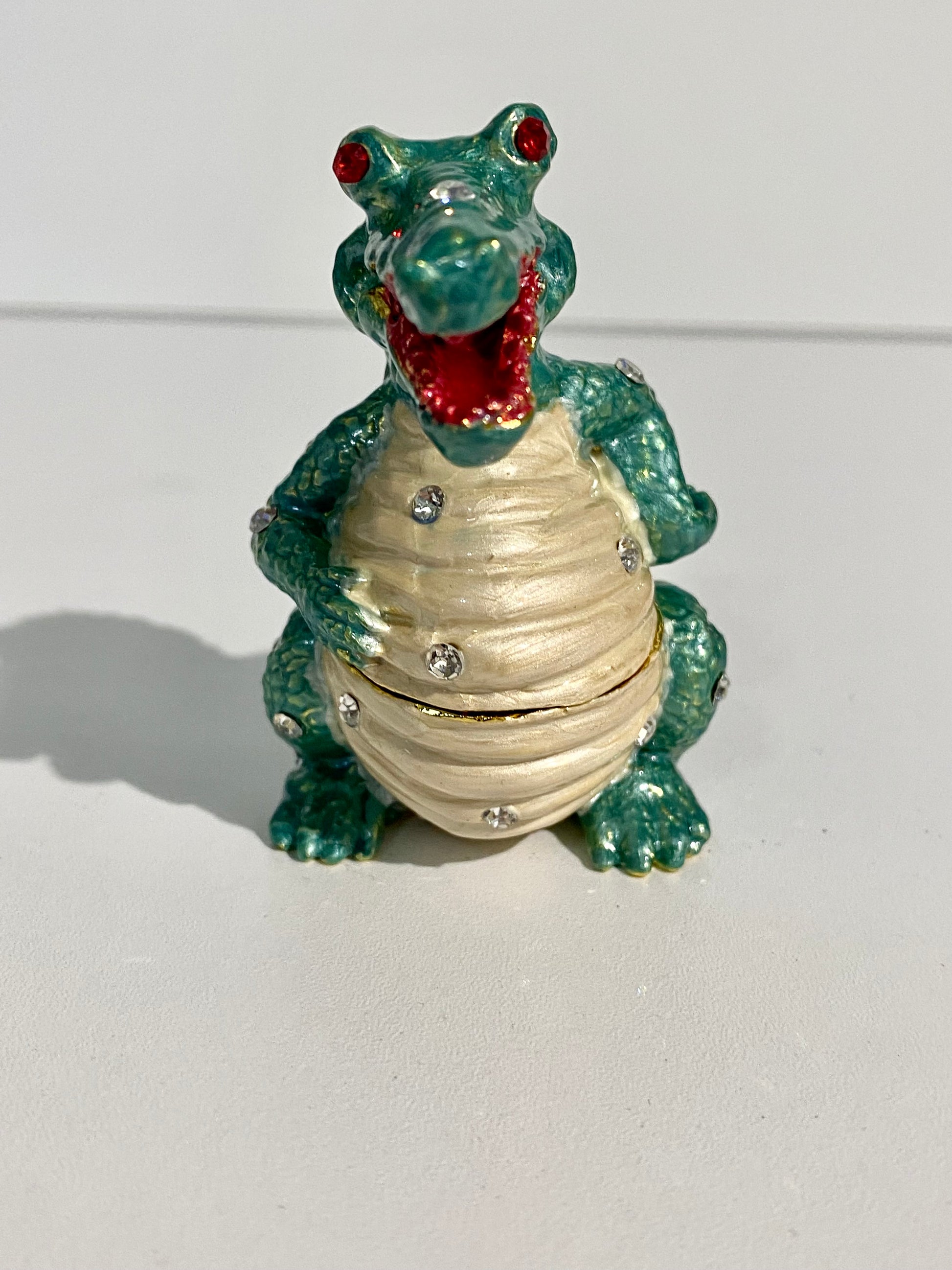 This fun green sitting alligator trinket box features gold encrusted crystals with ruby eyes. Keep this box as home décor, store small jewelry or gift to a friend or girlfriend!